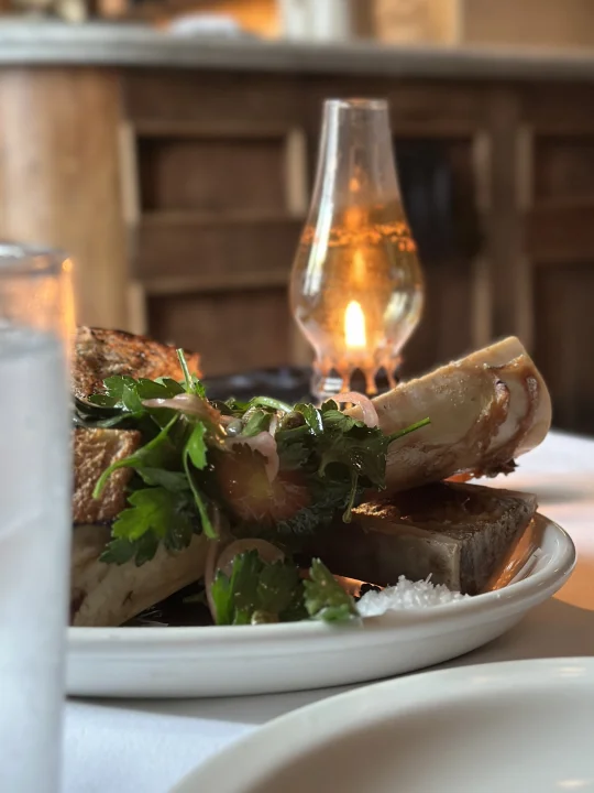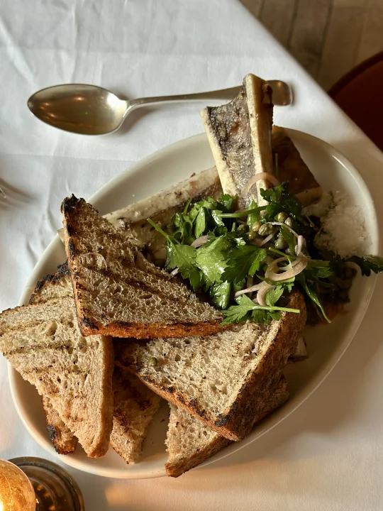 牛骨髓肥美,配菜沙拉腌制过的洋葱酸口开胃解腻