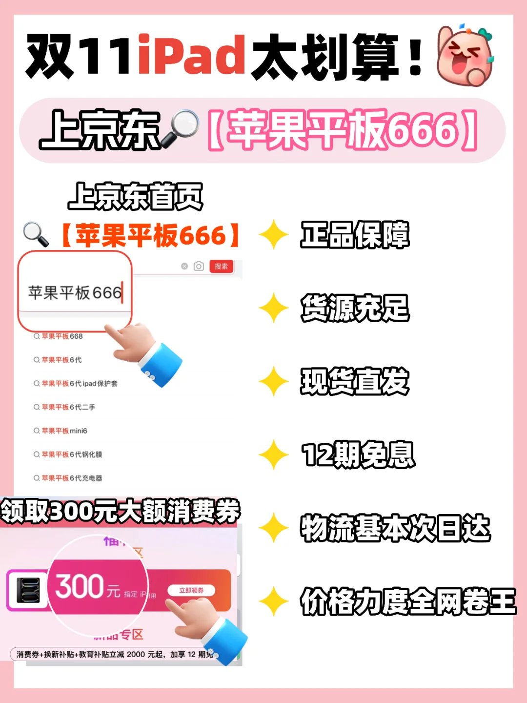 👉想要省大钱的宝子上,千万不要错过这次11.11,上京东🔍【苹果平板666】一键进入活动会场,就能优惠福利拉满,这时候低价拿下iPad新机,真的太香了冲冲冲!