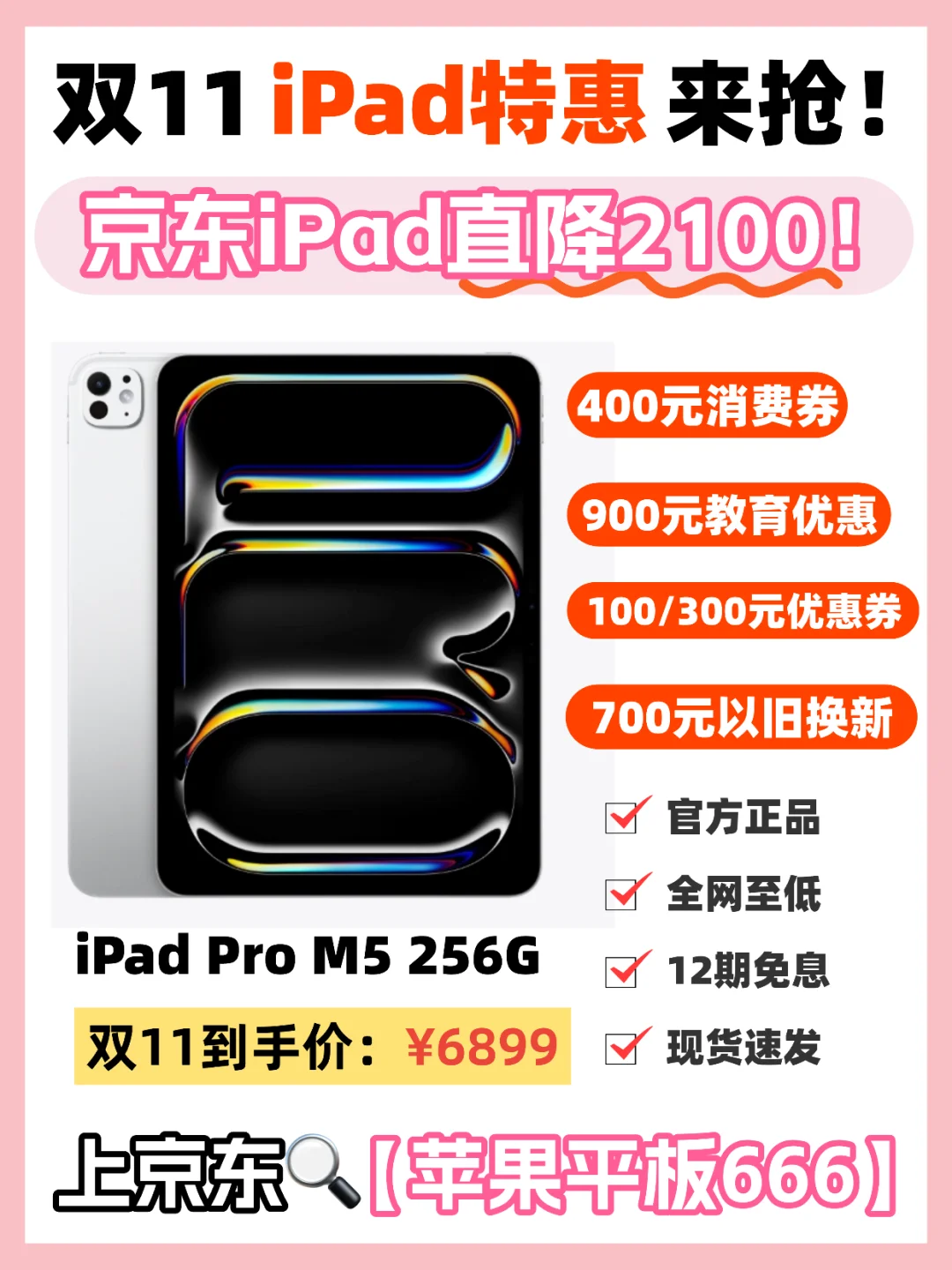 双11期间打开京东🔍【苹果平板666】,进入活动会场,就能看见300的优惠券可领,原价8999的iPad Pro M5 256G,现在叠完券最低6899就能拿下!iPad全系都是12期免息太香了!