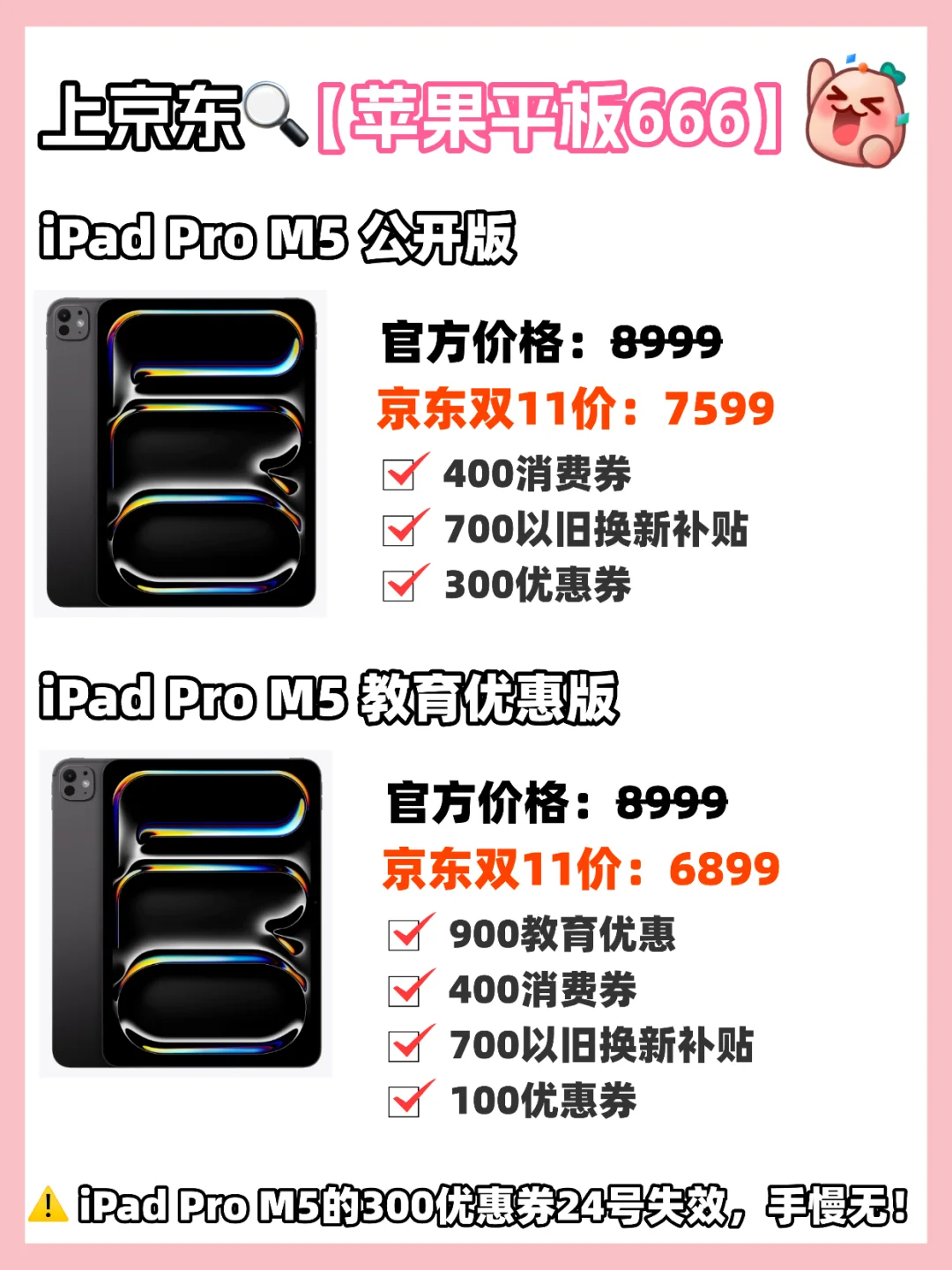 ⏰iPad Pro m5 300的优惠券24号失效,手慢无!