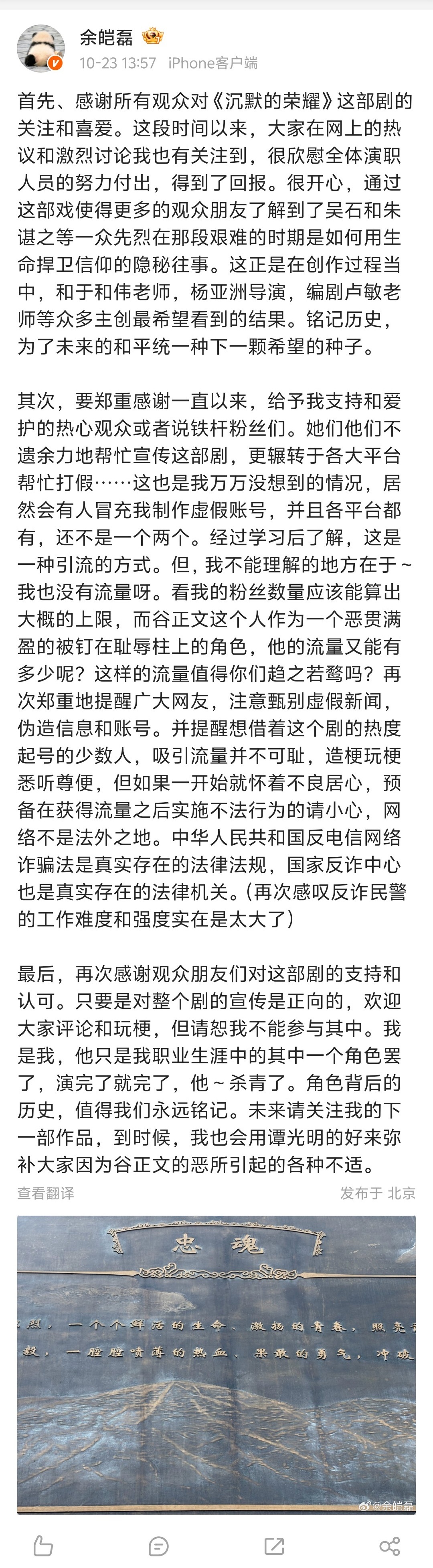 【余皑磊打假假账号】余皑磊辟谣 23日,演员发文,感谢所有观众对《沉默的荣耀》的关注和喜爱,他提到,近期有人冒充他在各平台制作虚假账号,他不理解,“谷正文这个人作为一个恶贯满盈的被钉在耻辱柱上的角色,他的流量又能有多少呢?这样的流量值得你们趋之若鹜吗?”他提醒广大网友注意甄别虚假新闻、伪造信息和账号,同时提醒那些起号的少数人:吸引流量并不可耻,造梗玩梗悉听尊便,但如果一开始就怀着不良居心,预备在获得流量之后实施不法行为的请小心,网络不是法外之地。