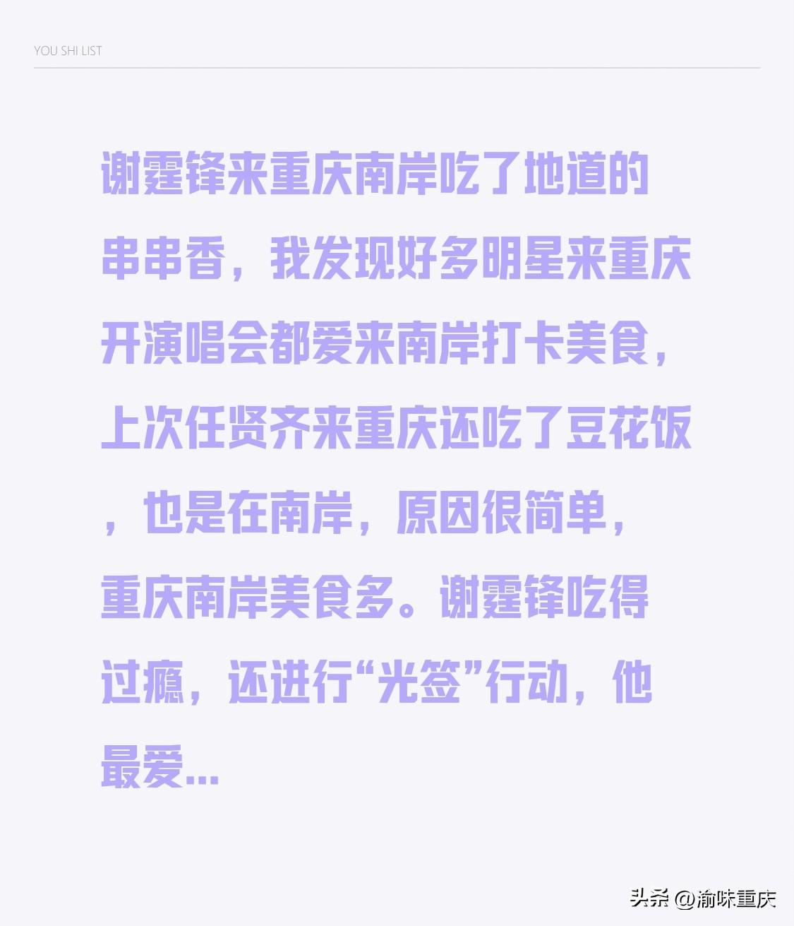 谢霆锋跑到重庆南岸,吃了地道的串串香。我发现好多来重庆开演唱会的明星,都爱到南岸打卡美食。上次任贤齐来重庆,也在南岸吃了豆花饭。原因很简单,重庆南岸美食多。 谢霆锋吃得那叫一个过瘾,还搞了个“光签”行动。他就喜欢在地道的馆子吃东西,这儿的串串又辣又香,把他心情都整美了。他吃串串必点的百叶、黄喉,在南岸的小馆子里肯定能吃上。重庆身边事 南岸美食