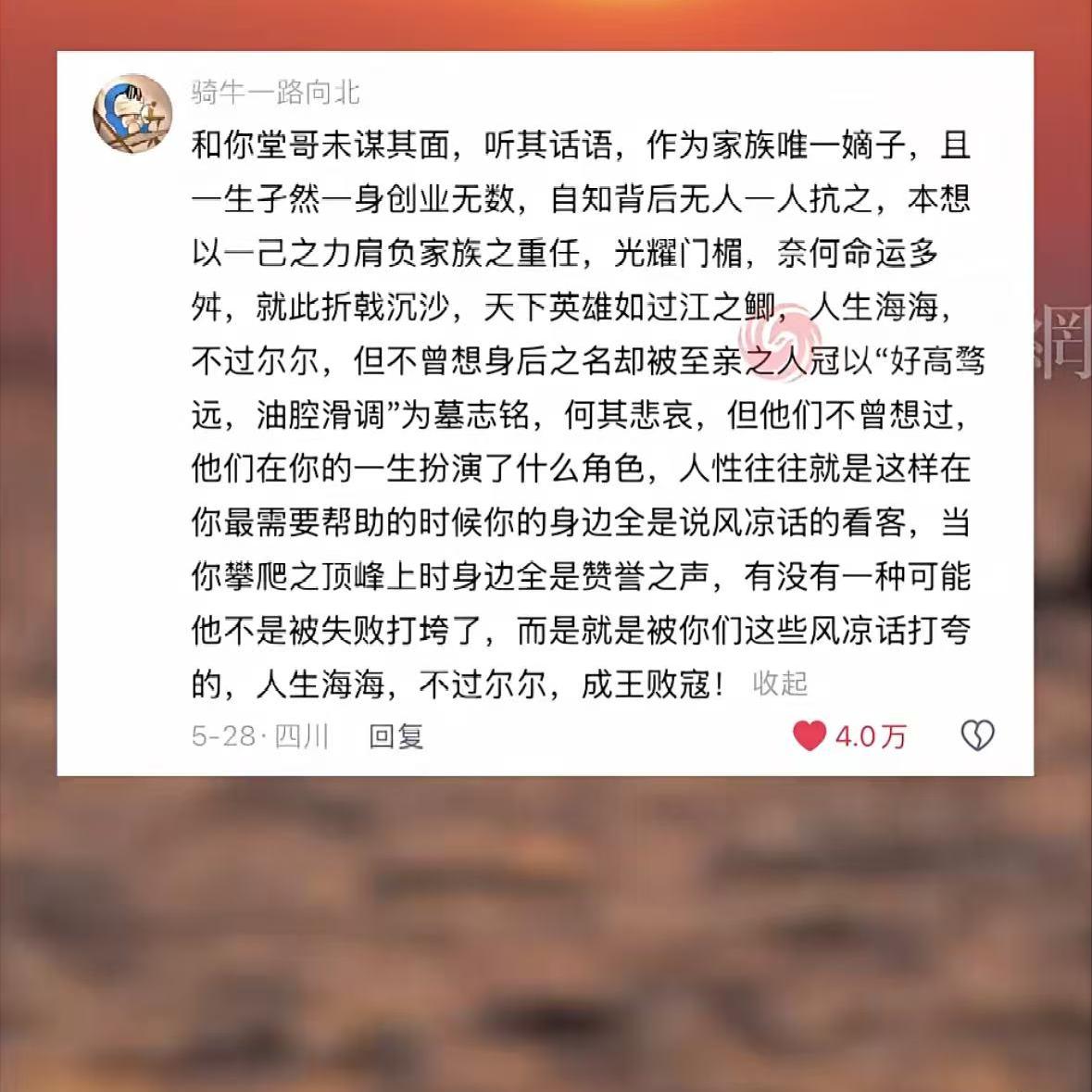 49岁创业离世,堂妹评价他好高骛远,一事无成,然而网友却说他只是没有成功而已,现