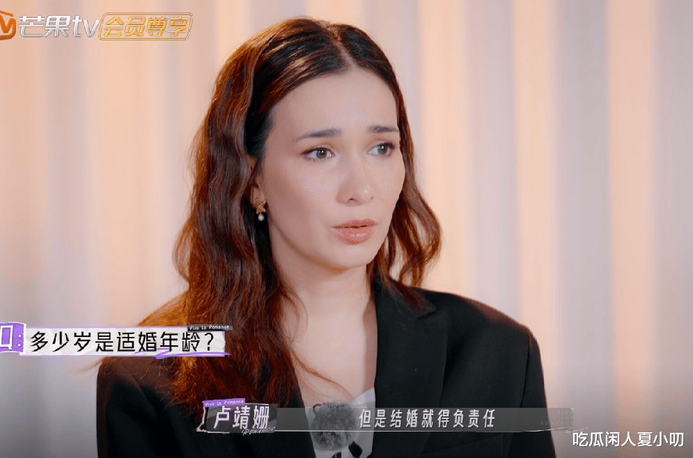 对于多少岁是适婚年龄这个问题,卢靖姗回答:我觉得有一些人适合结婚,有一些人是真的不适合结婚,所以我觉得没有年龄这个说法。但是结婚就得负责任,你要说负不了责任,那就别结婚。