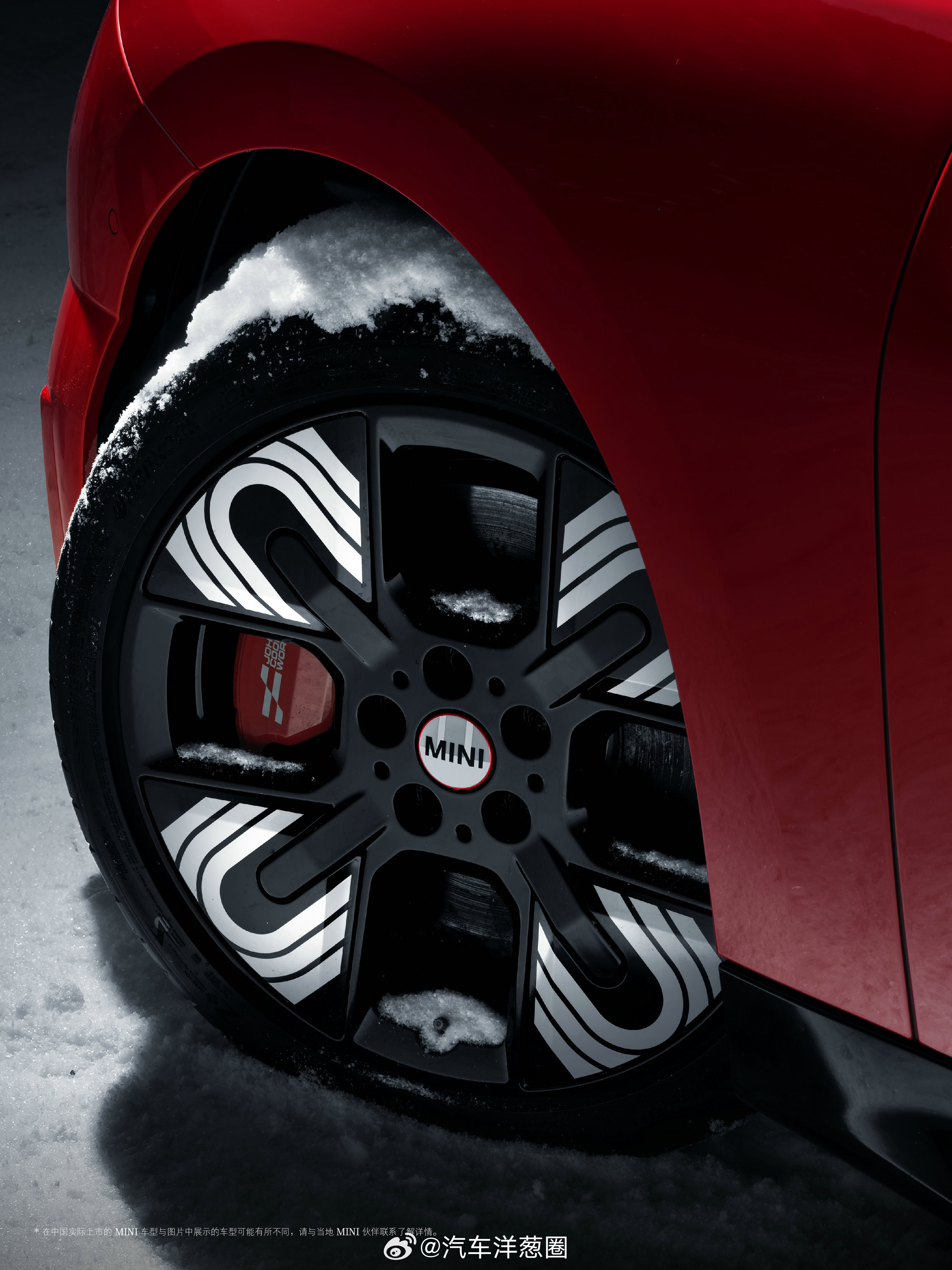 红车身+白顶,上面是雪地轨迹压纹