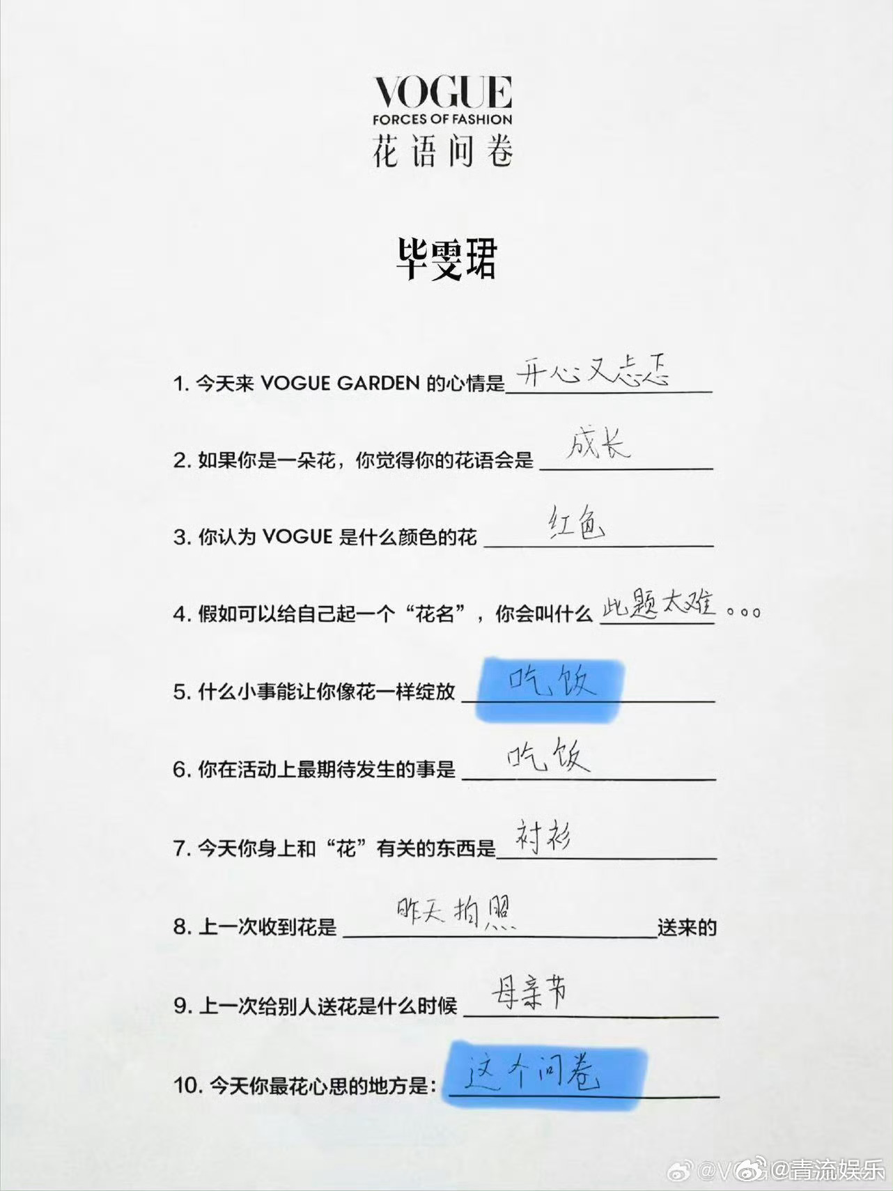 毕雯珺VOGUE盛典最花心思是填问卷毕雯珺说吃饭能让我像花一样绽放 VOGUE花语问卷太有梗了[哈哈][哈哈]“吃饭可以让我像花一样绽放”“今天最花心思的地方是这个问卷”[酷] VOGUE直播