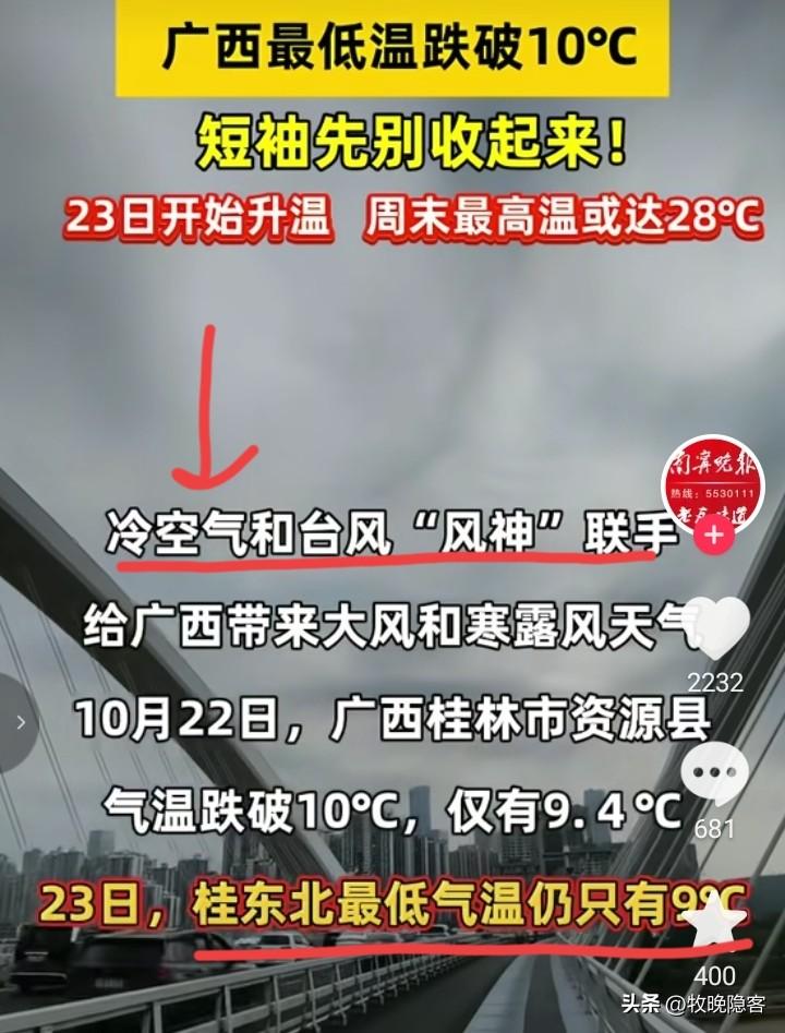 广西风大天冷, 尤其是北部地区,一夜之间就从短袖换成棉衣,从炎热的夏天变成了寒冷的冬天。好家伙诶,一看是冷空气和台风风神的杰作。 难怪那么冷,也是提前过上了冬天。感觉今年广西的天气真的是特别癫,台风天就够呛了,然后热天和冷天也特别极端。