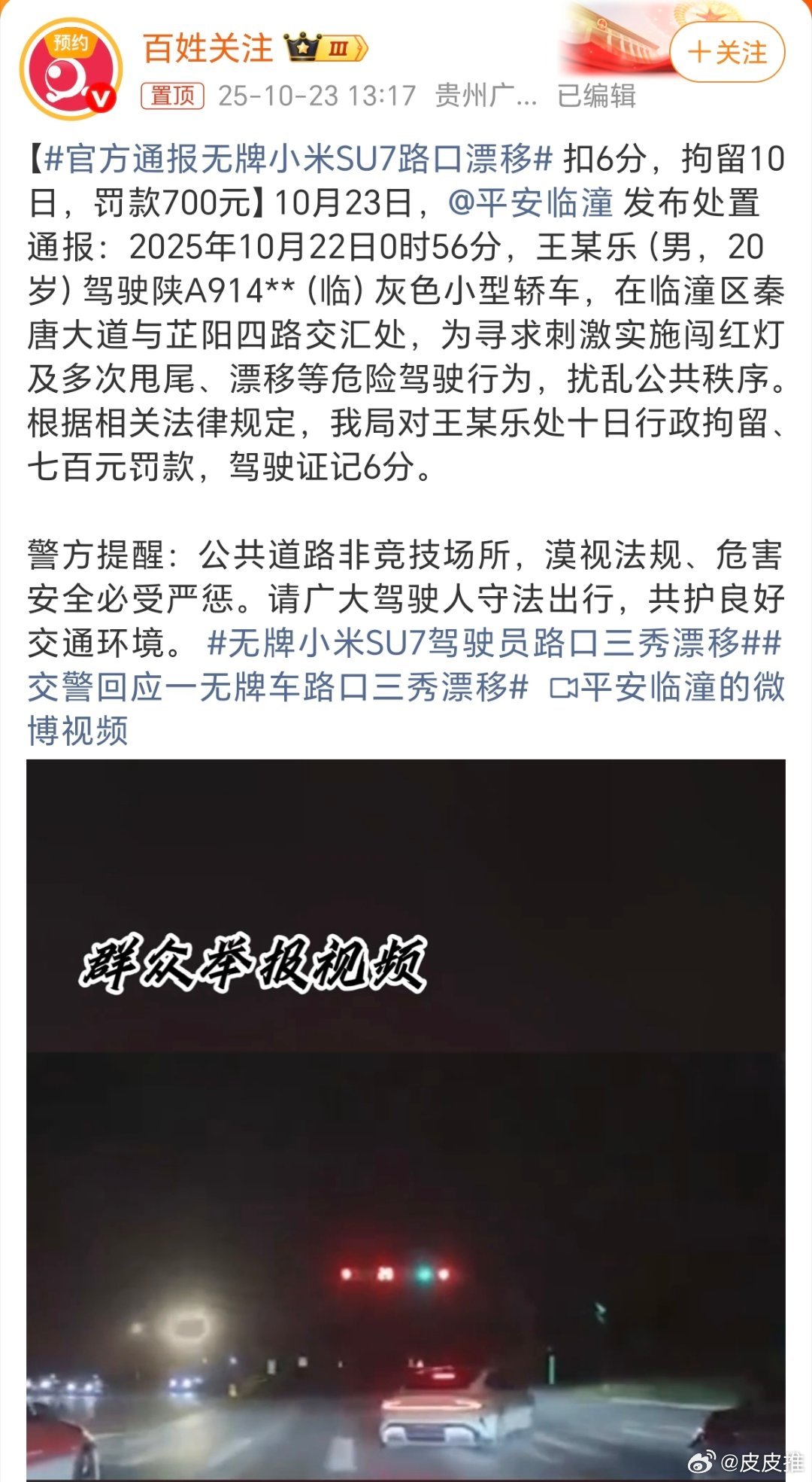 官方通报无牌小米SU7路口漂移这是幸好没出事故,出了事就玩完了!