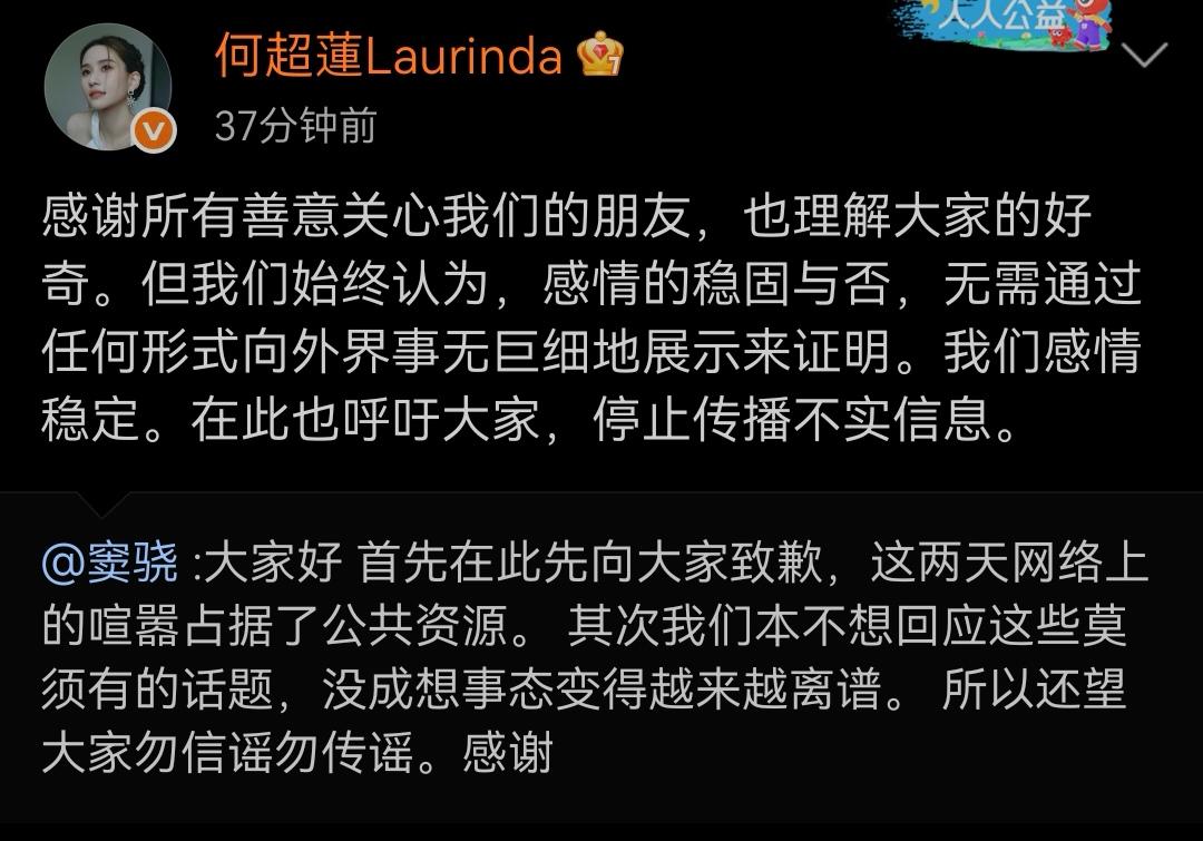 窦骁何超莲终于回应了,但这回应也太糊弄了。这是道歉还是辟谣?说是道歉吧,他们自称没做错任何事。说是辟谣吧,辟了什么谣呢? 真要辟谣,最疑似、伤害性最大的谣言就是:何超莲严防死守自己的财产,窦骁单方面花光了积蓄,这是真的吗? 跟这个关联的是,离婚了没?还是说,从一开始就压根没领证,没结婚也就谈不上离婚? 最重要的,这些传言的源头是向太。如果说是谣言,那要不要起诉向太?