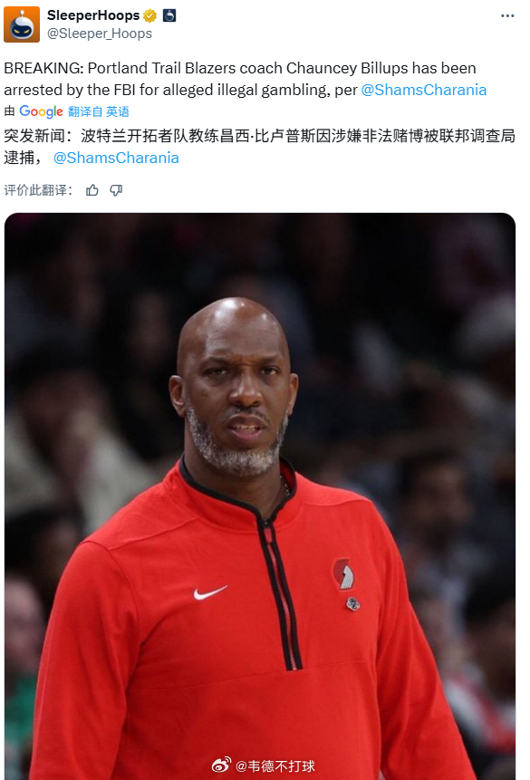 突发新闻:波特兰开拓者队教练昌西·比卢普斯因涉嫌非法赌博被联邦调查局逮捕[哆啦A梦害怕]