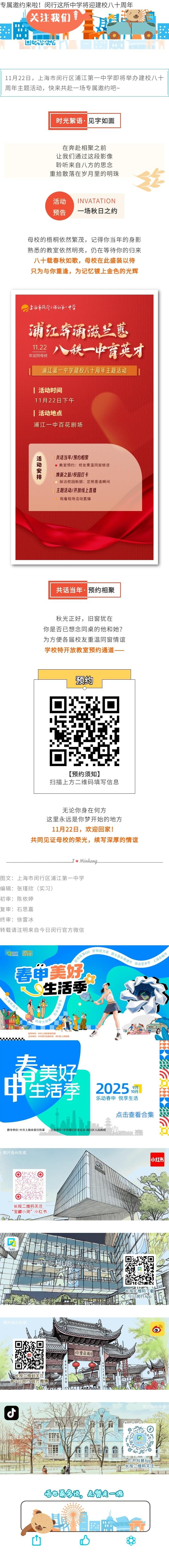 【专属邀约来啦!闵行这所中学将迎建校八十周年】闵闵分享 11月22日,上海市闵行区浦江第一中学即将举办建校八十周年主题活动,快来共赴一场专属邀约吧~