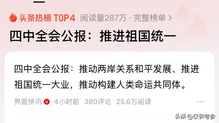 振奋人心,四中全会公报再提:推进祖国统一。篇幅不多,我眯着眼看了好些遍,发现有两句话让我心怦怦跳:推动两岸关系和平发展、推进祖国统一大业。 不知道是不是我记岔了,以前的经常性表述为:推进祖国和平统一。 “推动”侧重于使事物继续发展,而“推进”则强调使事物向预定目标前进并取得进展,侧重结果和明确方向。 推动两岸关系和平发展,是我们一直在做的,而我们最终的预定目标,就是完成祖国统一这个大业。隐隐感觉,两岸统一的进程在加快,期待这一天早日到来,还是那句话,祖国必然统一,也必须统一。 刚听闻,力挺两岸统一的台退役中将被判7年半,内心很不舒服,两岸一家亲,老将军,用不了多久,你就会看到台湾这个游子回归祖国母亲怀抱的。