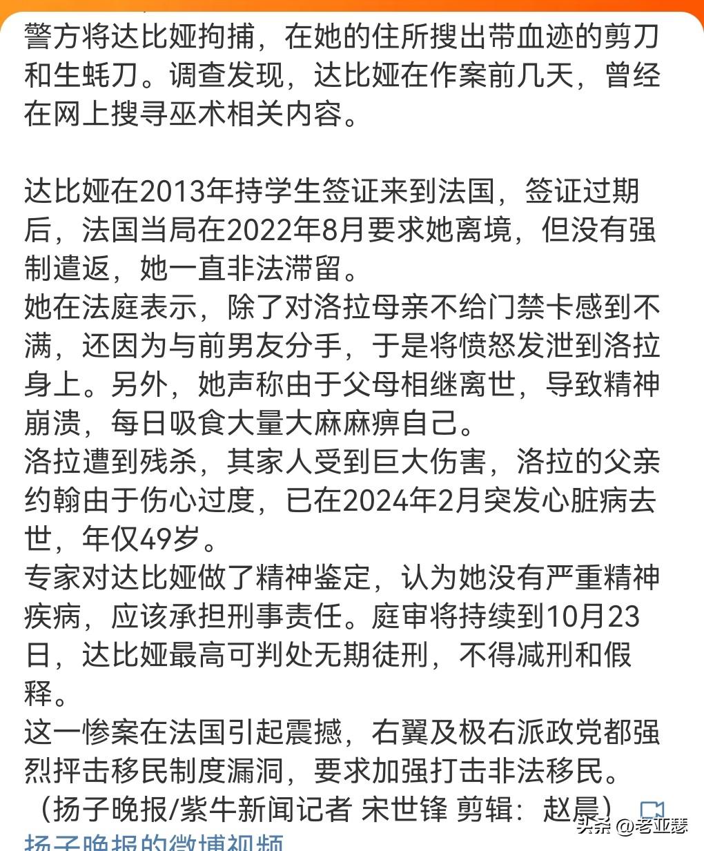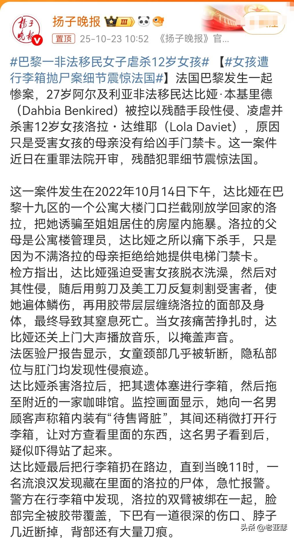 究竟是于心的泯灭,还是道德的沦丧?这也太丧心病狂了吧。 2022年10月,巴黎一非法移民女子虐杀12岁女孩,并且还性侵了女孩。 起因是女孩的父母没有给犯罪分子电梯门禁卡。 女孩的父母是公寓管理员。 女童的颈部几乎被斩断。 这名非法移民女子实在是太残忍了,心理素质异于常人的高。 更悲剧的是,由于悲伤过度,女童的父亲后来也死于心脏病。 而女子最多只能判无期徒刑。 希望能严惩。