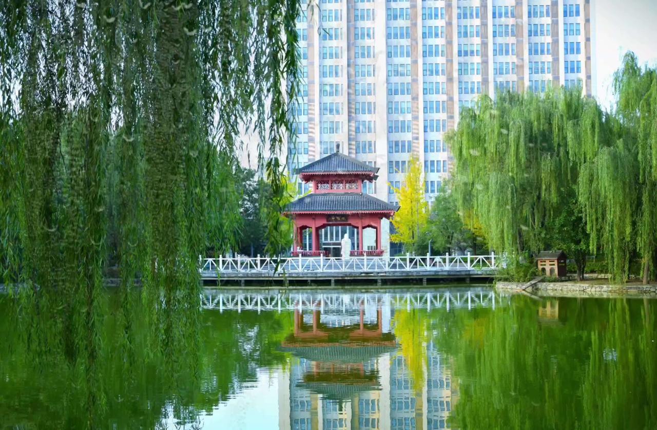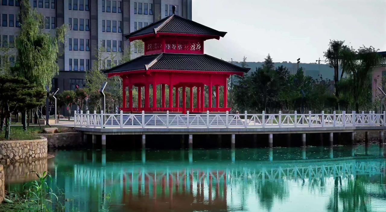 宝鸡文理学院文理映像 校园里的红亭立于碧水之上,白栏环绕,与垂柳、楼宇相映成趣,一汪湖水似镜,倒映出满园雅致,是学子们心之向往的诗意角落。 (Via:校融媒体中心)