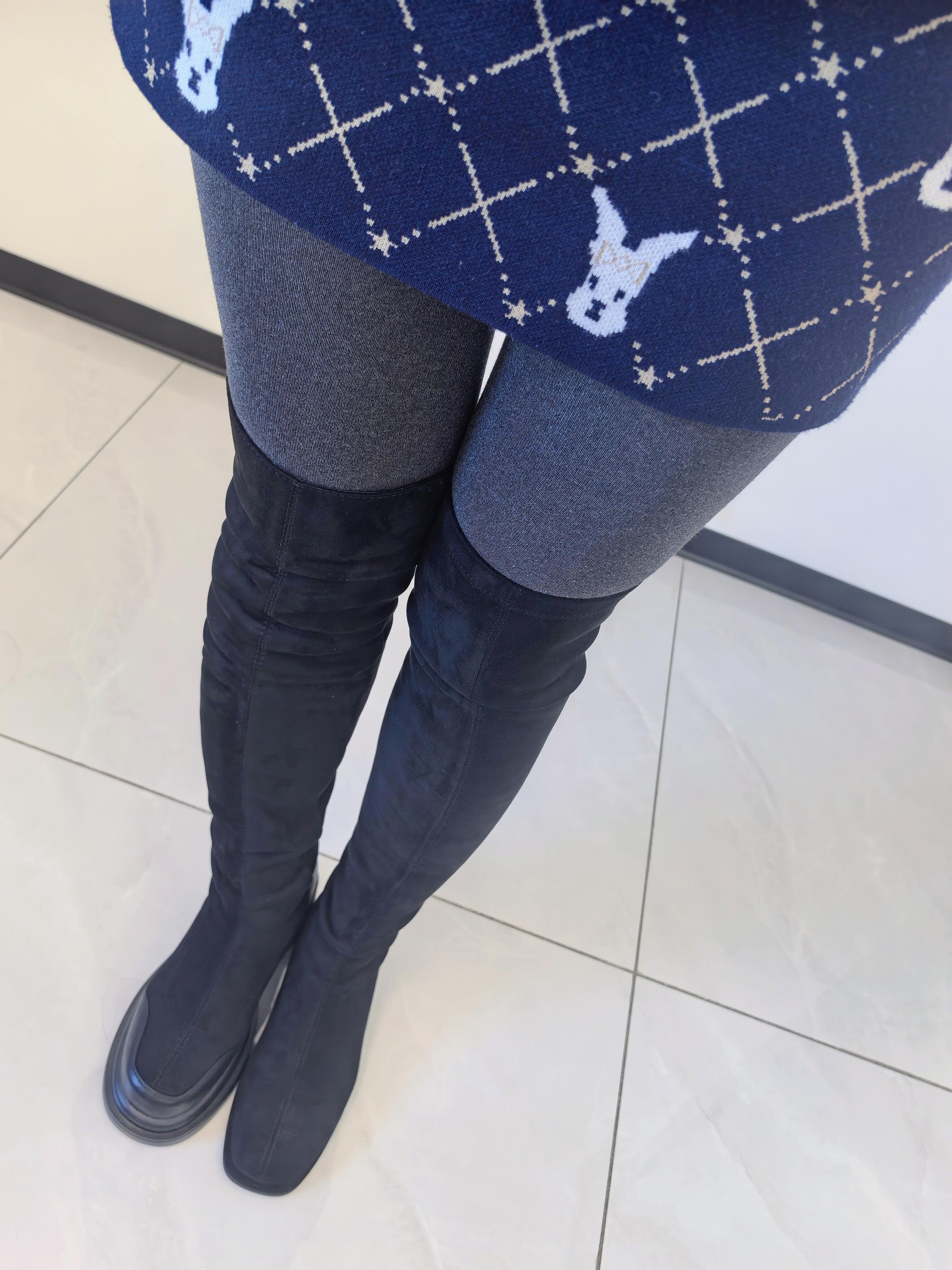 左靴简约方头款 方头细中跟 修身弹力绒面