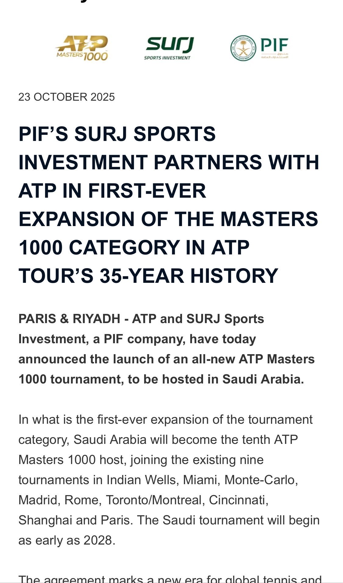 沙特在经历了数年谈判和资本运作之后(从吉达新生力量总决赛,到利雅得六王表演赛)最终成功加入ATP巡回赛大家庭。一加入就是大赛——ATP大师系列赛35年历史首次将扩充至10站赛事。沙特大师赛最早将于2028年上演,办赛时间大概率是澳网之后的2月份(这也很可能会动了多哈和迪拜站的“蛋糕”)。
