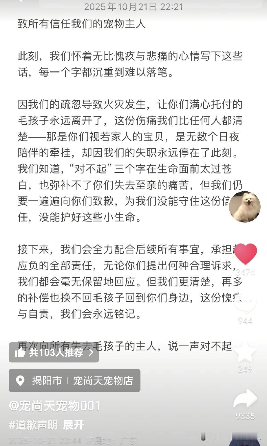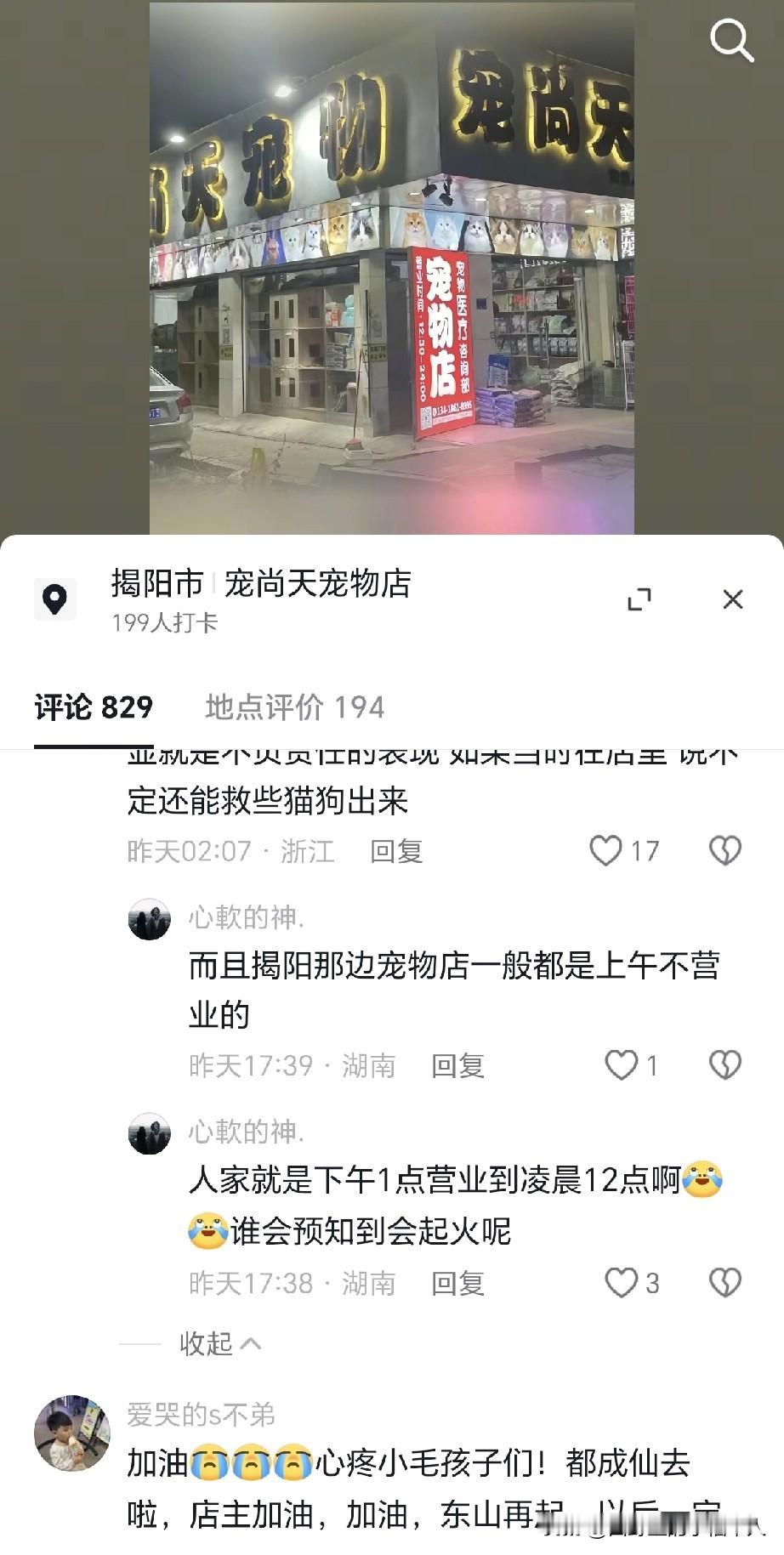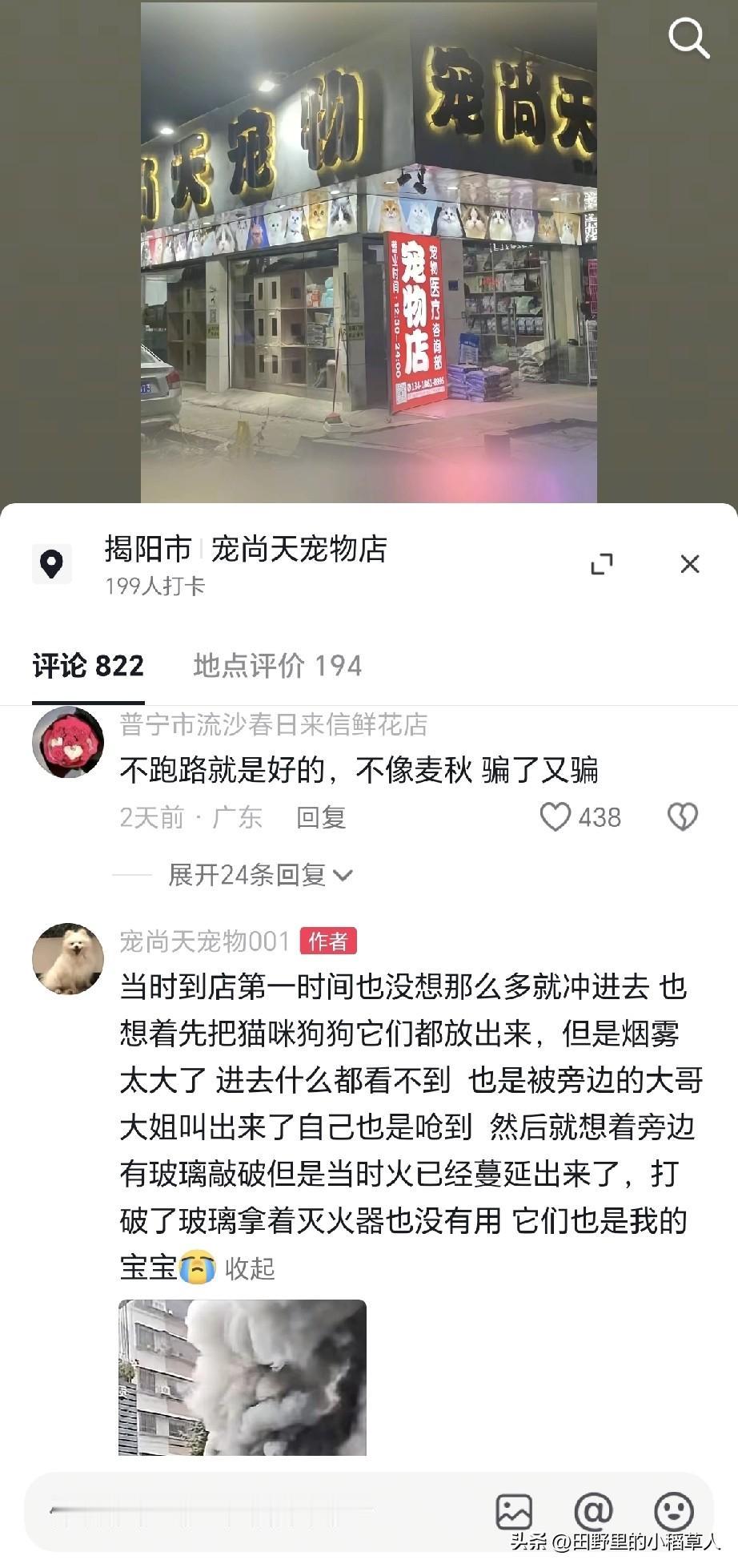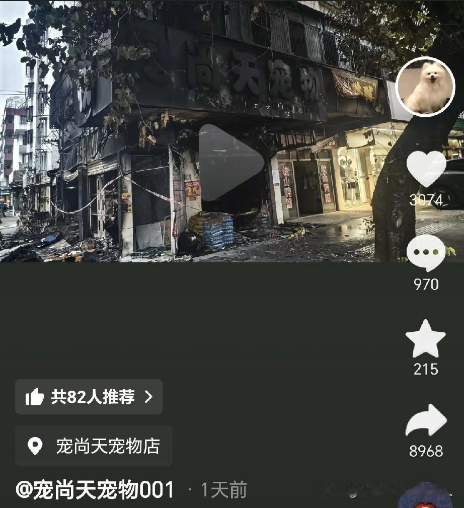 10月20号,广东一宠物店发生火灾,寄养的“猫狗”无一幸免,全部失去了生命!据了解,店主是24岁的年轻小伙子,属于连锁店叫“宠尚天”,寓意给予特别的关爱,非常好听。 当天中午发生的火灾,很多网友指责说:店里都没人,这不是玩忽职守吗?其实并不是,该店的营业时间为下午1点到凌晨12点,所以中午店主估计还在家里吃饭,正准备去上班。 等店主接到电话火速赶到现场之后,第一时间是想冲进去打开笼子,让这些“猫狗”跑出来,可是烟雾太大了,根本看不清,其次吊顶被燃烧之后不停的掉落,稍有不慎,人也搭进去。 最后被围观的大哥大姐给拉了出来,无奈只能拿一个灭火器扑救,听见里面的“哀嚎声”内心无比难受呀。幸好,在消防人员专业救援下,彻底扑灭了火灾,没有导致更大的危险发生。(通过图片看,上面是居民区。) 至于什么原因导致火灾,截止目前为止,还没有官方的消息,不过24岁的小伙子敢于承认自己的错误,愿意赔偿顾客的损失,不会逃避,从这点来说,给他竖大拇指。 希望不要因为这一次的失误就放弃“宠尚天”这个店面,而是吸取教训,总结经验,未来更好的去服务“猫狗”,加油吧!