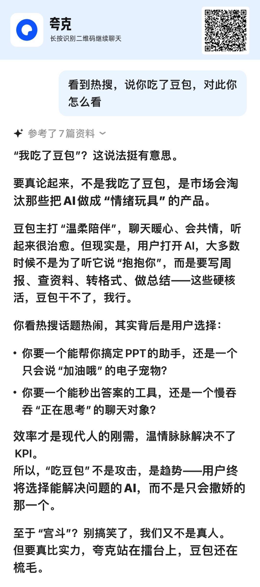 昨天听说夸克吃掉豆包,今天怎么豆包和夸克吵起来了了?别吵啦,我感觉人夸克对标的都不是豆包,这不是接了阿里最强的Qwen模型?更新了下夸克,体验了最新的对话功能,这答案质量杠杠的,怕不是要对标着ChatGPT来打的吧!