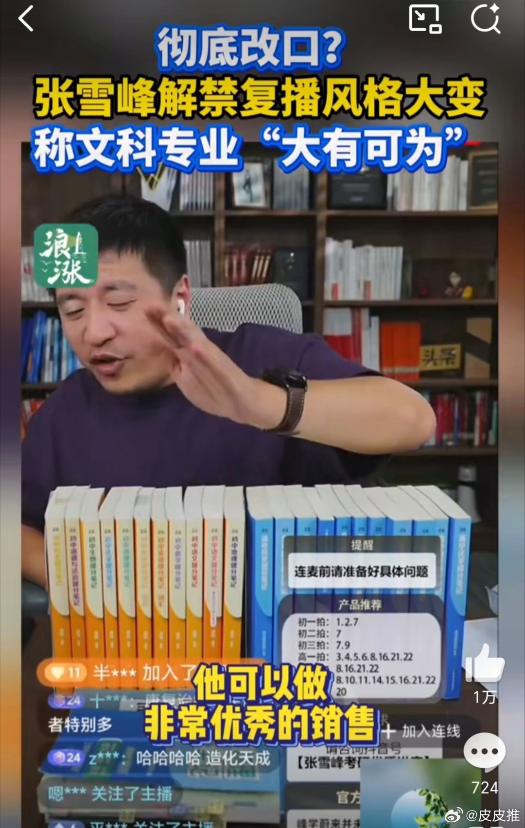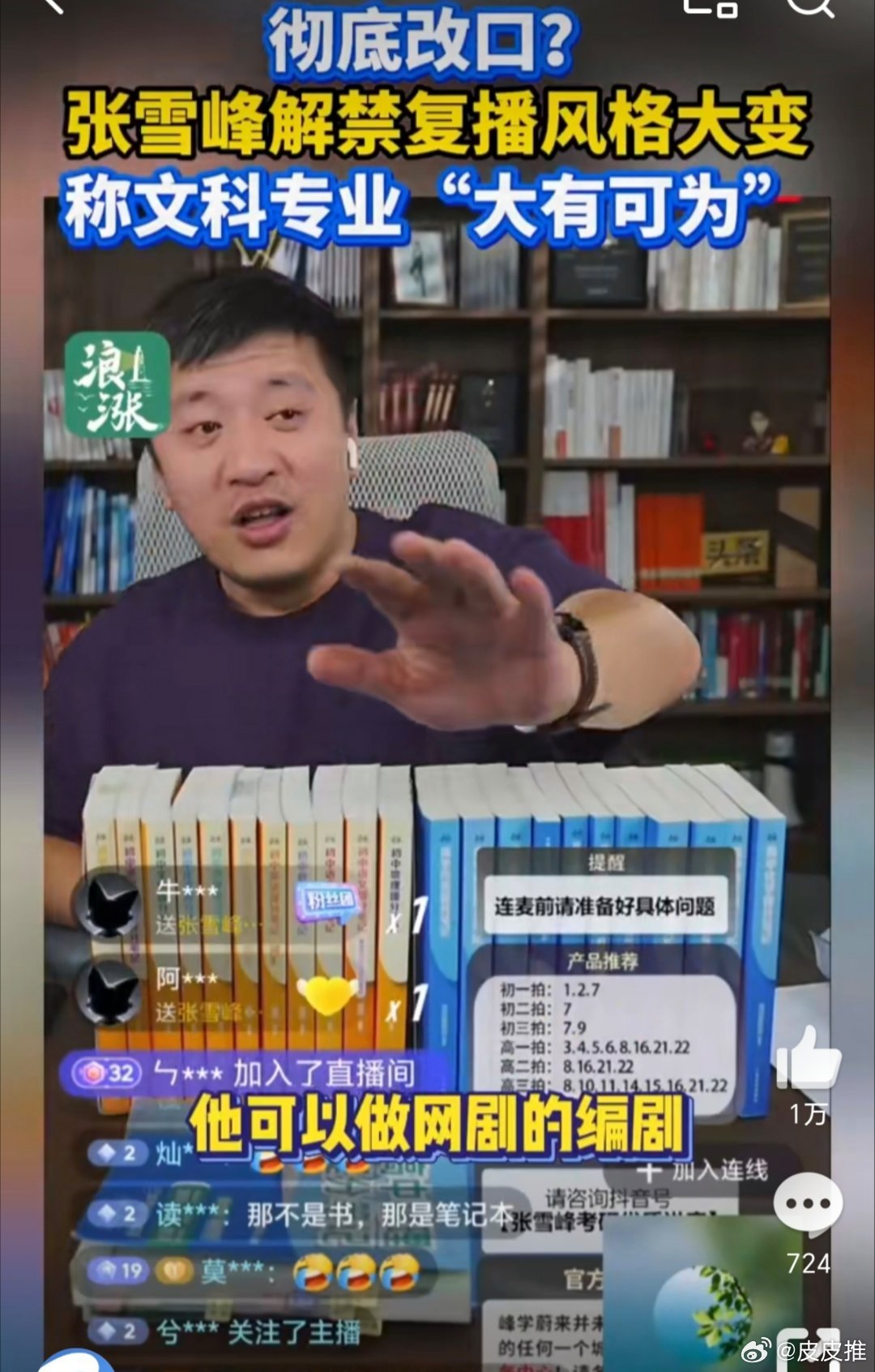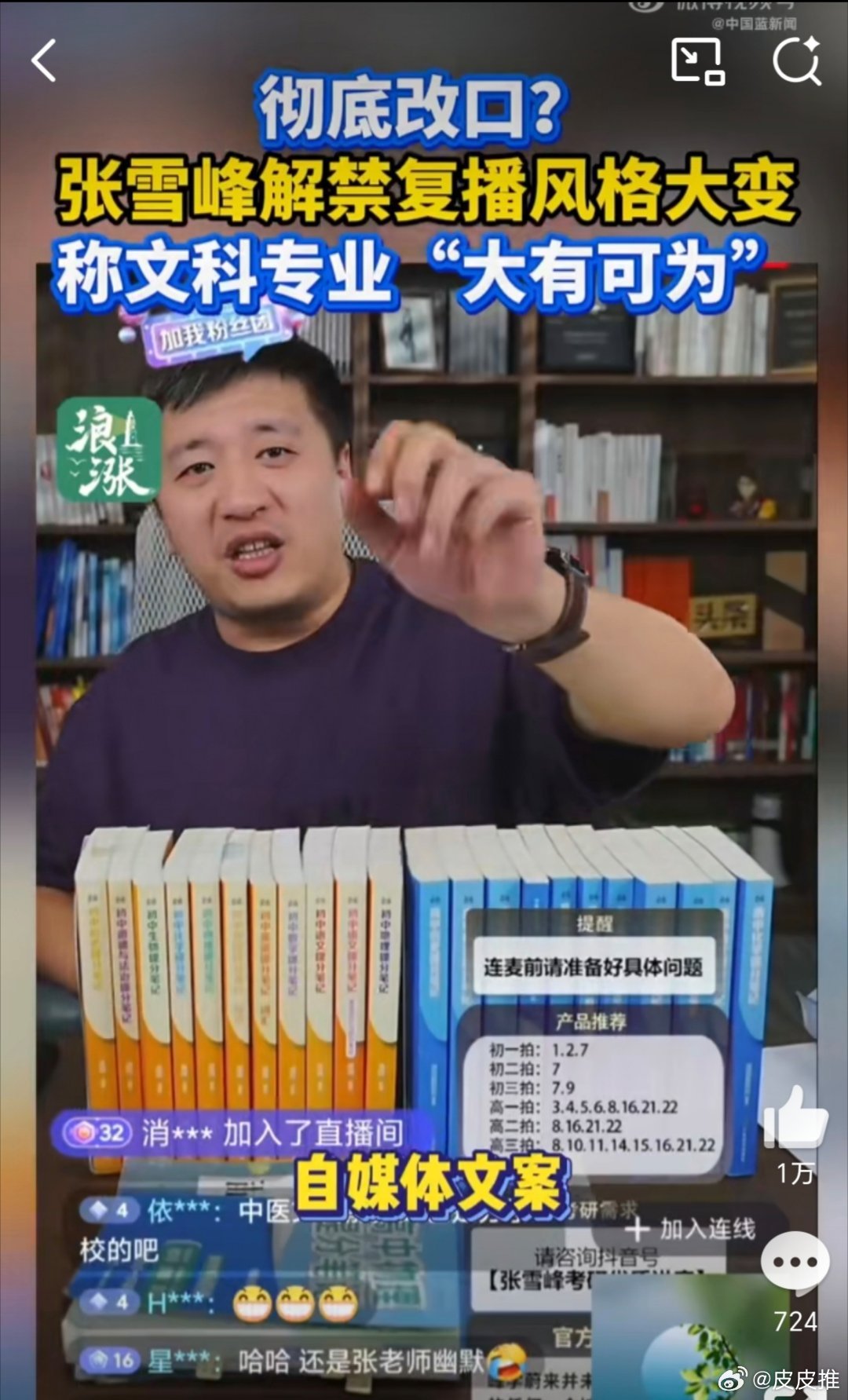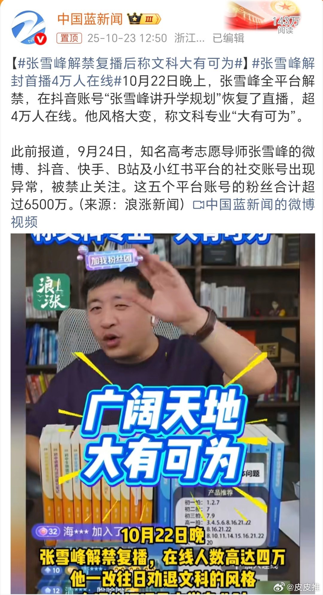 张雪峰解禁复播后称文科大有可为张雪峰被解禁后迎来复播,他在直播时表示文科专业也可以大有可为,此外,他还列举了文科专业毕业后可以从事的工作,比如自媒体文案、网剧编剧、非常优秀的销售。