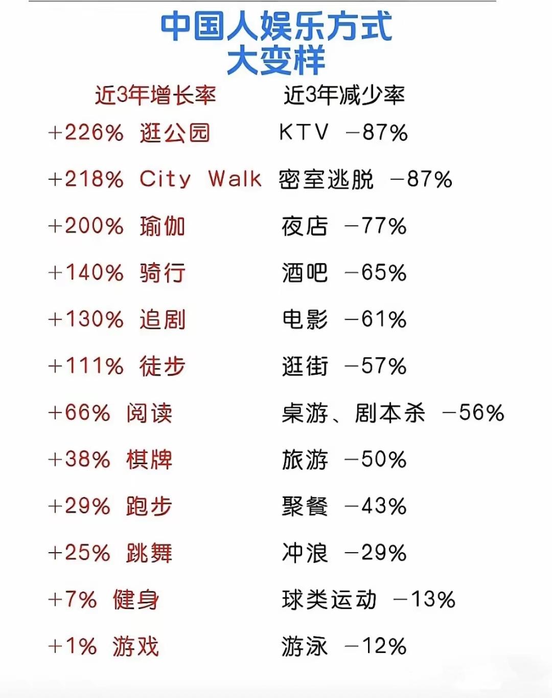 中国人娱乐方式大变样,尤其是中年人。有人统计了近3年增长和减少的部分娱乐方式,还挺有意思的。 近3年增长率较高的娱乐方式有:逛公园(+226%)、City Walk(+218%)、瑜伽(+200%)、骑行(+140%)、追剧(+130%)、徒步(+111%)、阅读(+66%)、棋牌(+38%)、跑步(+29%)、跳舞(+25%)、健身(+7%)。 而近3年减少的比较多的有:KTV(-87%)、密室逃脱(-87%)、夜店(-77%)、酒吧(-65%)、逛街(-57%)、桌游和剧本杀(-56%)、旅游(-50%)、聚餐(-43%)、球类运动(-13%)、。 看出来了没,花钱的少了,不花钱的多了!主要还是钱的问题。增长类多是低成本、高性价比且有长期价值(如逛公园、运动、阅读),符合大众对理性消费的追求;减少类多是高消费或非刚需娱乐(如KTV、旅游、聚餐),受消费谨慎心态抑制。 但也有人不这么认为,非经济因素更关键。健康理念推动运动、慢生活类娱乐增长;疫情后线下密集社交意愿降低,导致KTV、密室逃脱等减少;技术和内容迭代让追剧、游戏等居家娱乐体验提升;兴趣从“外向消费”转向“内向成长”,比如从夜店转向阅读。钱是影响之一,但健康观、社交习惯、技术发展、兴趣偏好的作用更核心。 你们怎么看?周末了,欢迎探讨!