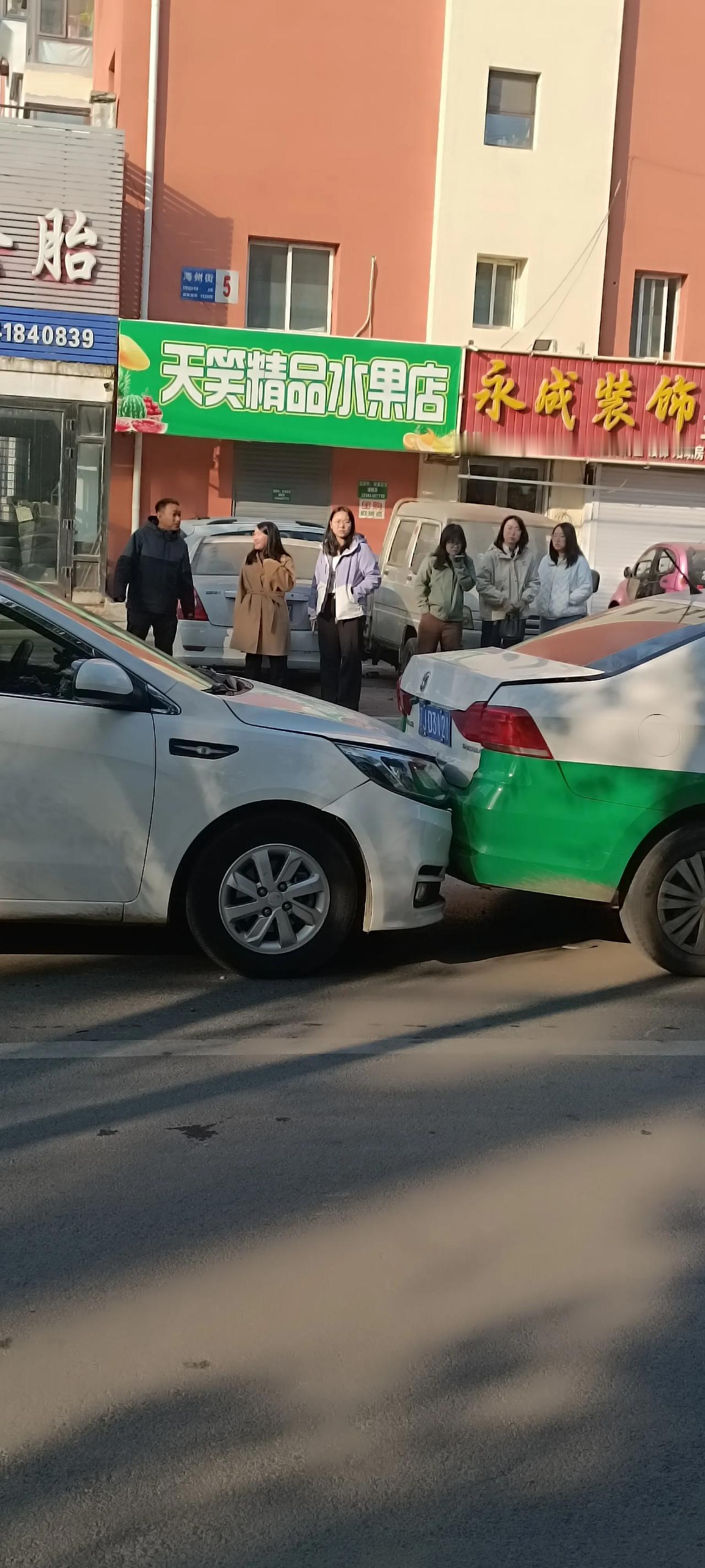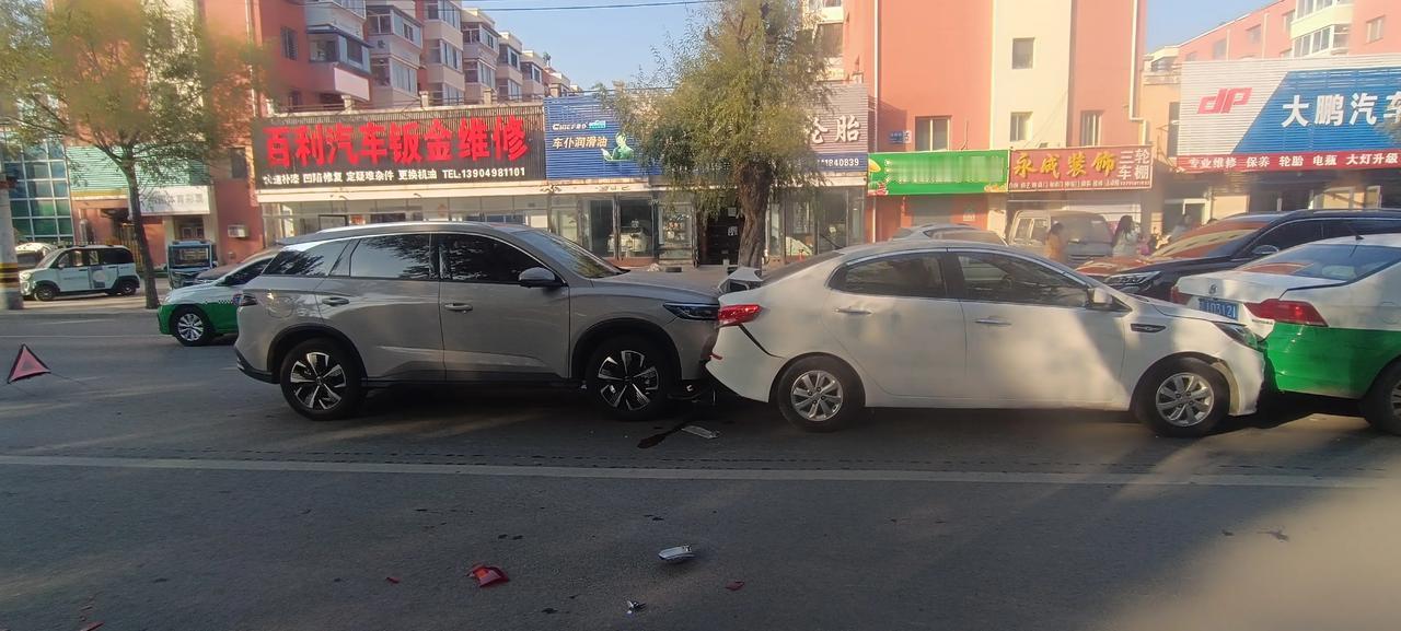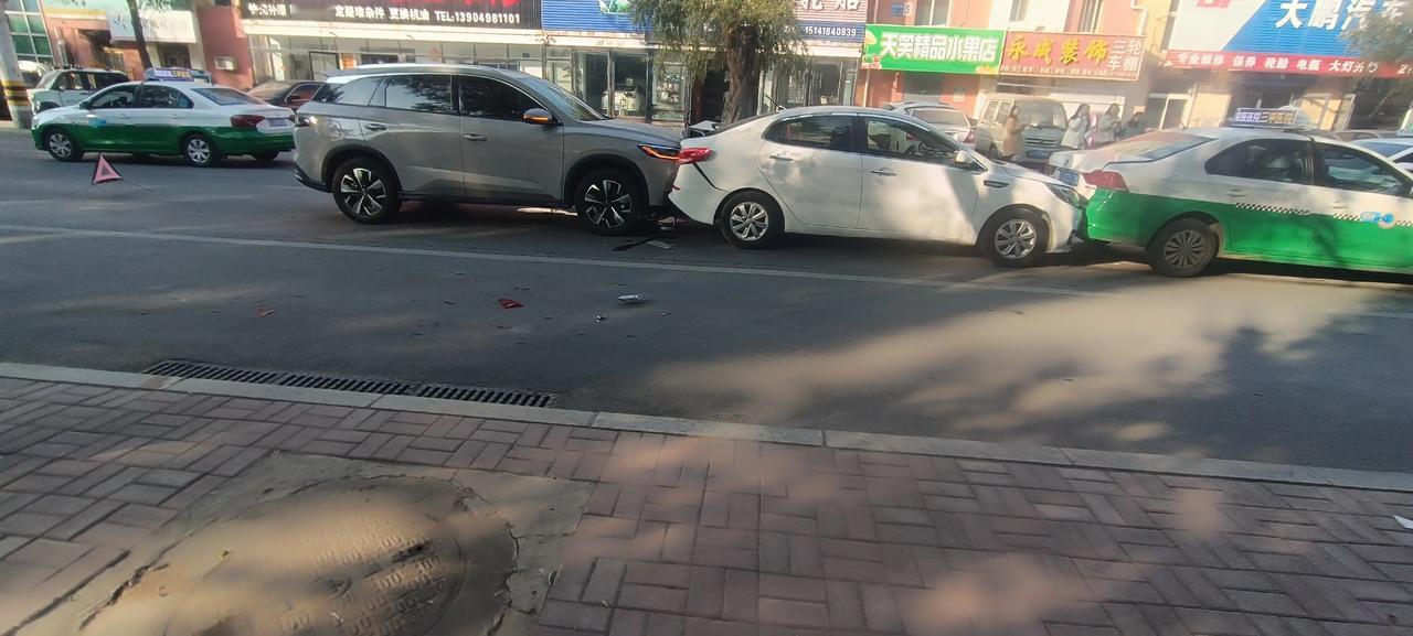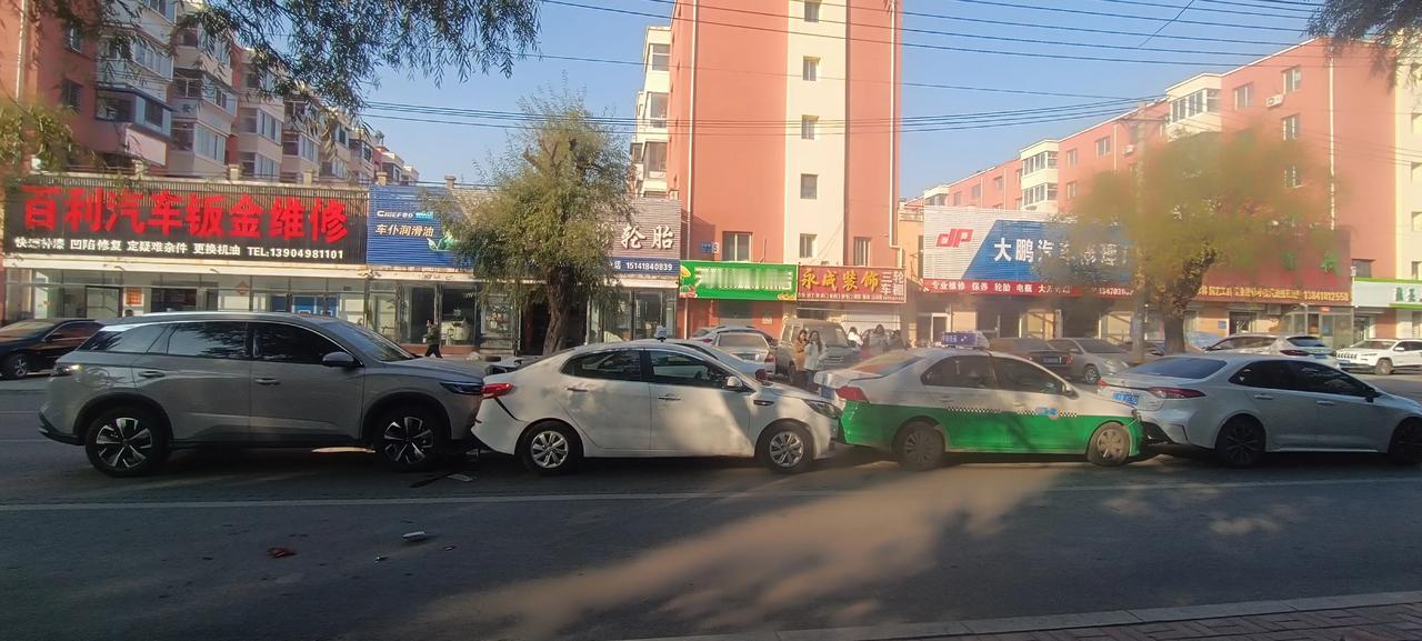早高峰,海州街四车追尾,罕见!究其原因,第一车太慢,后三车太快,尤其是最后一车,速度那是相当快,你看车前脸都要插到前车后备箱里去了!瞧那几位车主,大清早上班就来个撞撞撞!心情一定不美丽了!耐心等交警和保险来处理吧!再一次提醒广大车友,开车需谨慎,速度快慢一定要掌握好!