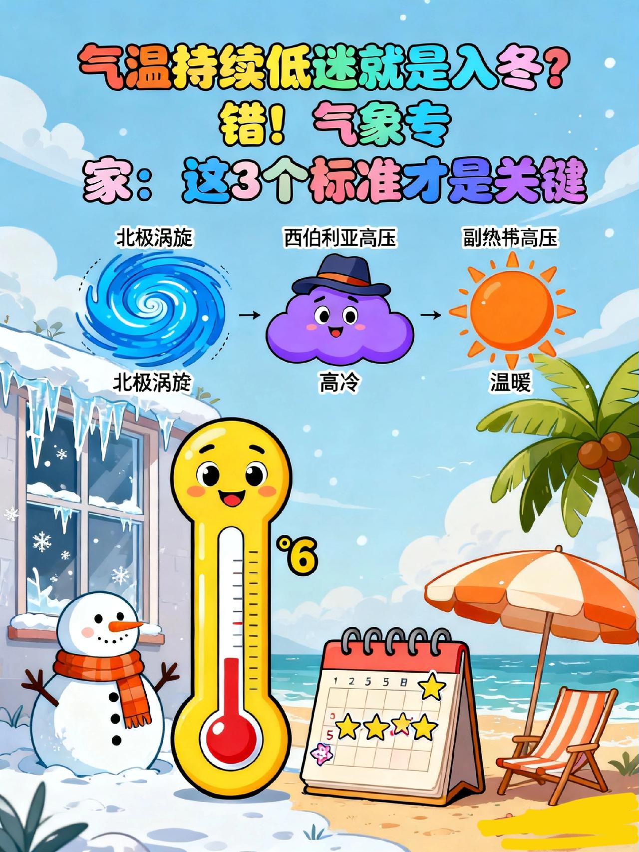 气温持续低迷就是入冬?错!气象专家:这3个标准才是关键 “冻得直穿羽绒服,冬天总算来了吧?”最近北方多地气温跌破5℃,南方也被阴雨冻得瑟瑟发抖,可气象部门却迟迟不“官宣”入冬——原来“冷”和“入冬”根本是两码事。 很多人凭体感判断季节,却不知道气象学上的入冬有铁规矩。根据《气候季节划分》国家标准,核心是“连续5天滑动平均气温稳定低于10℃”,第一个达标的日期才算入冬起点。就像山西太原,近期寒风刺骨,但后续最高温还会超10℃,根本没达到“稳定”要求。北京2024年入冬比常年晚4天,也是因为前期气温偏高,直到连续5天均值跌破10℃才官宣 。 为啥明明很冷却不算入冬?这背后藏着气候系统的“小把戏”。北极涡旋分裂导致冷空气南下,西伯利亚高压提前活跃,再加上副热带高压输送的暖湿气流,三重作用下出现阶段性低温,但这只是过渡季的“寒潮突袭”,并非冬季真正报到。就像湖北11月曾降温12℃,可气温一回升,入冬就泡汤了。 更有意思的是南北“入冬时差”。东北10月中旬就达标入冬,黑龙江已飘起暴雪;而广州11月还能测出34℃高温,正冲击“最长夏季”纪录 。这种差距,全因纬度不同导致的热量差异。 其实不管算不算入冬,寒冷都是真实的。毕竟体感温度受风速、湿度影响,5℃的大风天,体感可能接近0℃。与其纠结季节名称,不如及时添衣保暖。 你家现在穿啥厚度的衣服?觉得离真正的冬天还有多久?欢迎评论区聊聊~北方气温 入冬后体感温度 全国气温走势