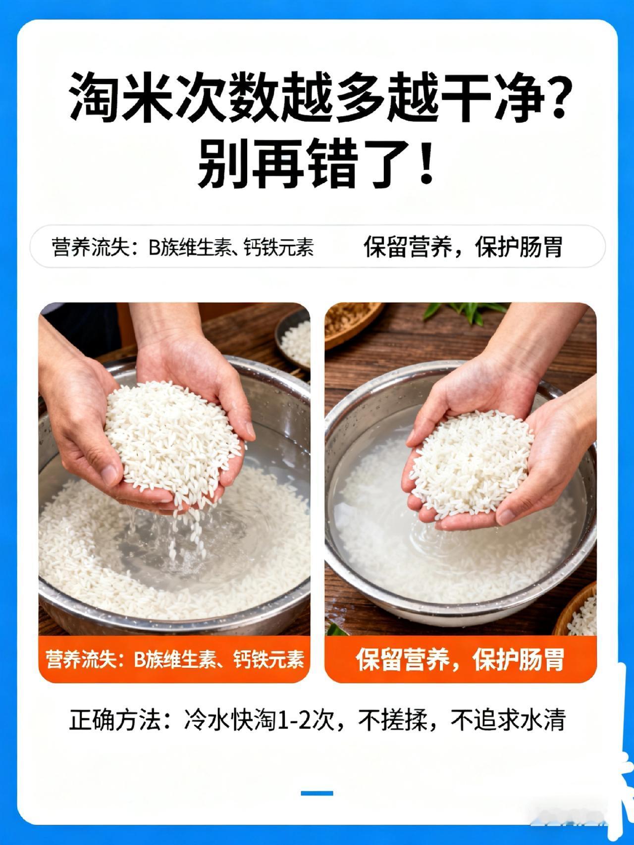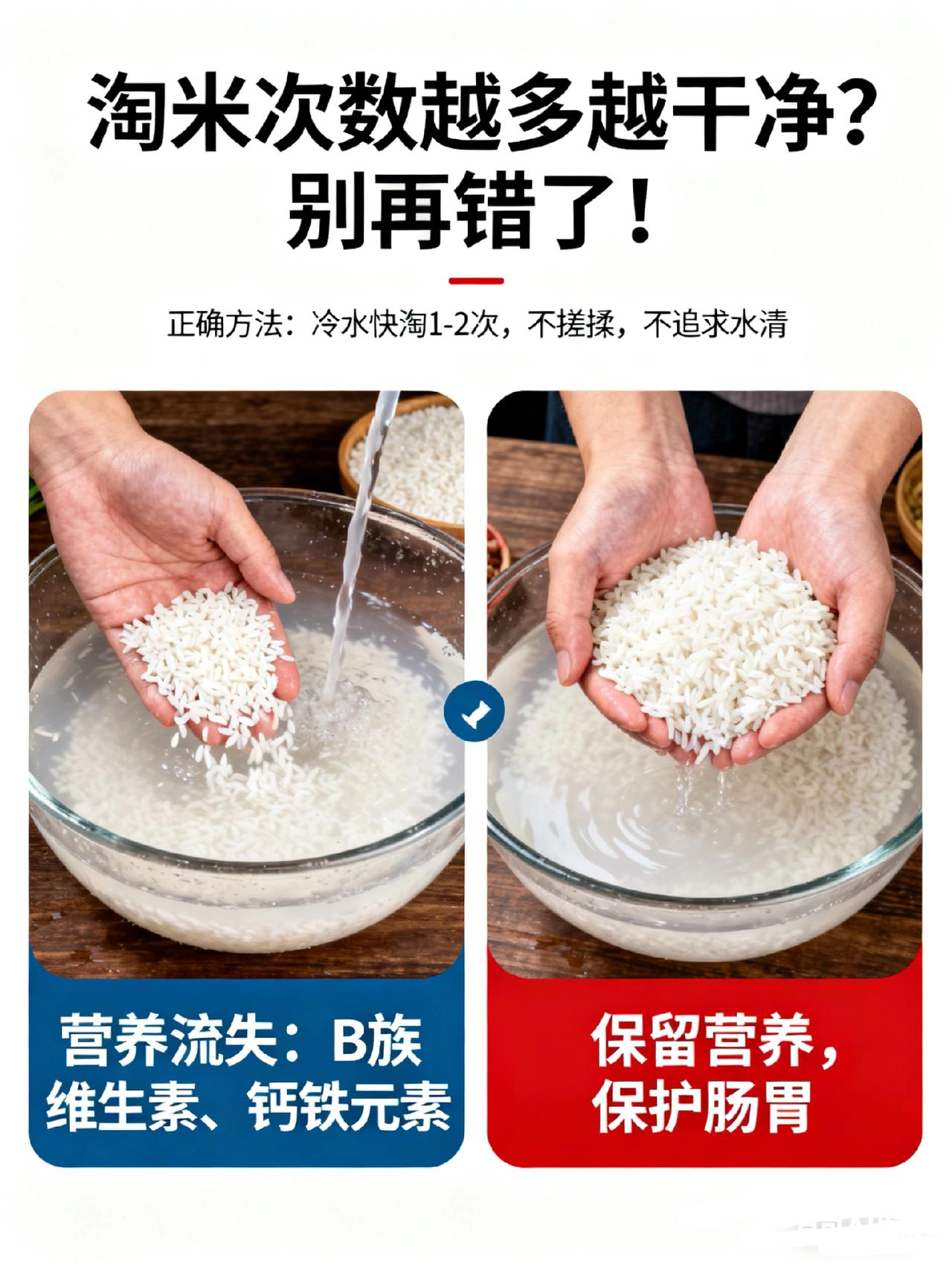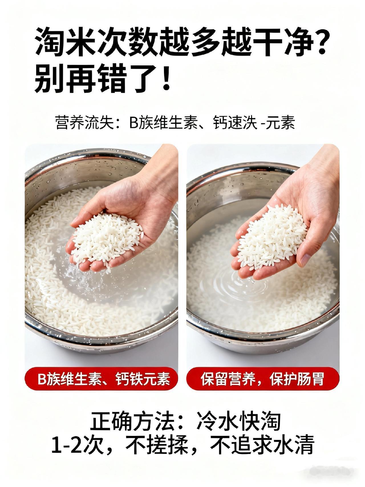 淘米次数越多越干净?别再错了!这样洗米,营养全流失还伤胃 “多淘几遍才放心!”不少人做饭时总习惯把米反复搓洗,甚至直到水变清澈才罢休,可你知道吗?这种“洁癖”反而会让米饭的营养白白流失,还可能埋下健康隐患。 小时候常听长辈说“淘米要搓出白浆才干净”,但现代大米加工早已不同。市售大米从收割到包装要经过多道除尘、去杂工序,表面的少量浮灰只需用清水快速冲洗1-2次就能去除。可若反复搓洗、用力揉搓,米中珍贵的B族维生素会随水流失——这种维生素能帮助代谢碳水,少了它,米饭的营养价值会大打折扣。 更让人想不到的是,过度淘米还可能伤胃。有实验显示,大米反复冲洗3次以上,淀粉会大量溶出,煮出的米饭黏性下降、口感变差不说,还会增加肠胃消化负担,老人和小孩吃了容易腹胀。而部分商家为提升口感添加的“营养强化米”,过度清洗会让额外添加的钙、铁等元素直接流失,等于花了冤枉钱。 其实正确的淘米方法很简单:用冷水快速淘洗1-2次,轻轻搅拌后倒掉上层浑浊的水即可,无需搓揉,更不用追求“水清”。很多人担心的“农药残留”,在正规渠道购买的大米中基本不存在,反而过度清洗才是“捡了芝麻丢了西瓜”。 做饭这件小事里藏着不少生活智慧,别让错误的习惯浪费了食材的营养。你家平时是怎么淘米的?欢迎在评论区分享你的小技巧~ 洗淘米水洗脸 大米的处理方式 淘米水洗头