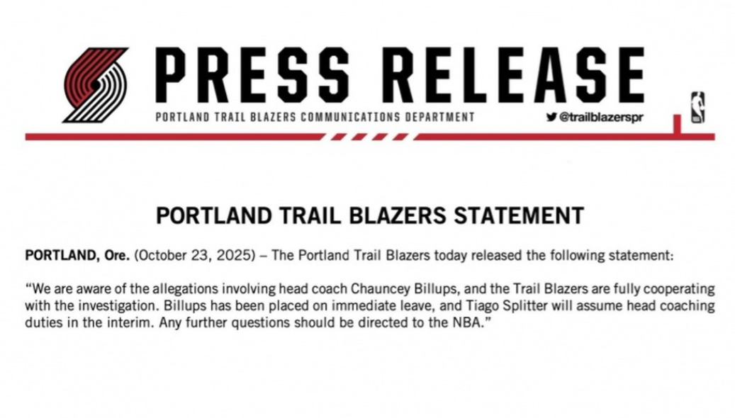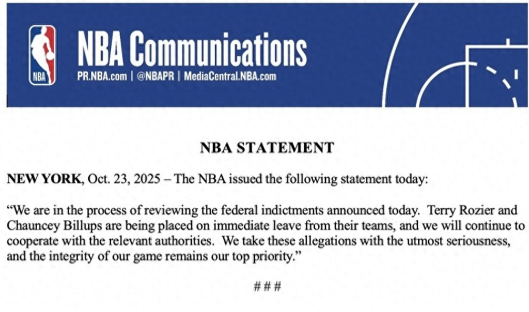 据美国媒体报道,波特兰开拓者主帅比卢普斯和迈阿密热火队后卫特里·罗齐尔因涉嫌非法赌博,于当地时间周四凌晨被联邦调查局逮捕。 NBA官方就比卢普斯、罗齐尔被FBI逮捕一事发布官方声明,勒令两人立即从所属球队离职。 以下是声明原文: NBA官方声明 纽约,2025年10月23日,NBA今日发布以下声明: "我们正在对今日公布的联邦起诉书进行回顾。特里·罗齐尔与昌西·比卢普斯即日起被要求离队暂停职务,我们将继续配合相关当局调查。我们以最严肃的态度对待这些指控,维护比赛公正性始终是我们的首要任务。" 开拓者官方同样发表声明,内容如下: “我们已知晓有关主教练昌西-比卢普斯的指控,波特兰开拓者正全力配合调查,比卢普斯即日起暂停职务,临时主教练一职将由斯普利特暂代,所有后续进展将由NBA统一处理。”