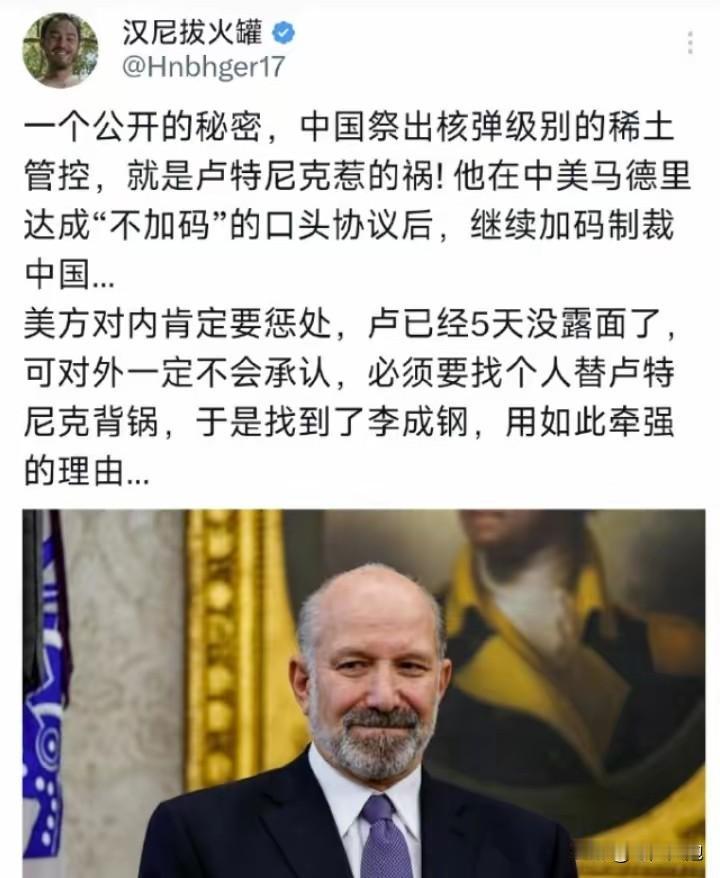 轮中美经贸谈判即将在马来西亚拉开帷幕。美国贸易代表格里尔和财政部长贝森特都已经飞往了马来西亚,而做为商务部长的卢特尼克却没有跟随,看来是被边缘化了!因为在中美马德会谈之后,双方达成不升级对抗的口头协议,结果卢特尼克转头又对中国实施制裁措施,结果激怒了中方。现在美国面对中方的稀土管控措施,没有任何招数破解,只能拿这个倒霉蛋卢特尼克下手了,虽然惹怒中方的不单单是这个商务部长,应该是集体决定,可是背锅侠只有一个,中方如果不反制,就是大家的功劳,现在把这货踢出局还有一个因素,就是向中方示弱,看我们把罪魁祸首凉到一边了!当然这次吉隆坡会谈,有没有成果,我认为关键在于美国的诚意。美国若是还打算用威胁的方式来谈判,基本上还是没有戏,希望美国能够认清现实,不要再拿自己以往的霸道作风来谈判,现在风向已经变了!