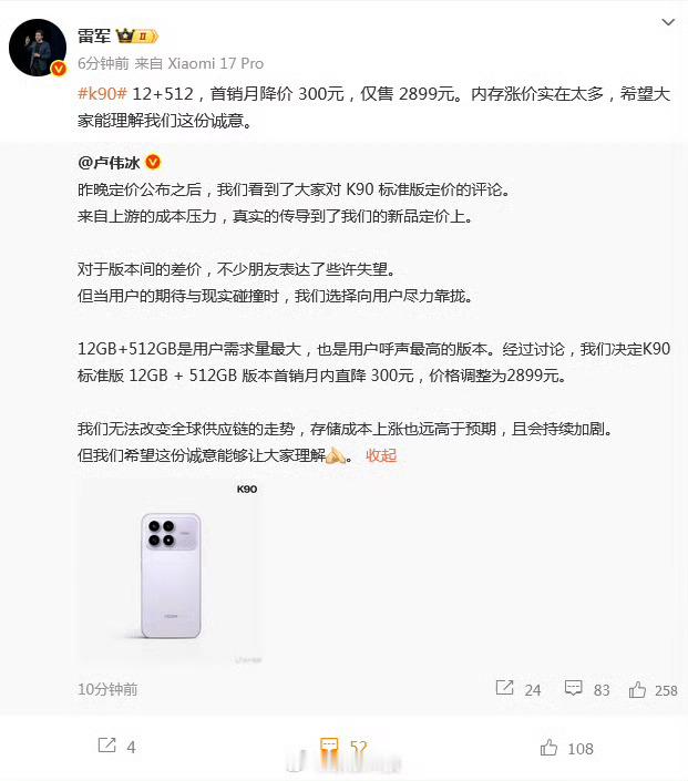 发文回应K90定价:内存涨价实在太多,希望大家能理解我们这份诚意。