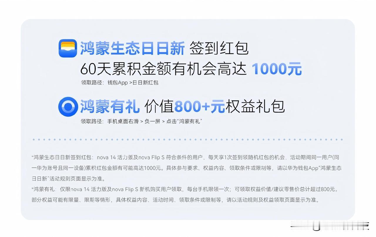 华为nova 14 活力版这一开售,我直呼超值!这2199的起售价这配置简直就是2000元档位最值得购买的5G手机!而且国补15%、双十一优惠、鸿蒙日日新红包和鸿蒙有礼权益礼包各种Buff叠加之下,才1000多就能拿下这款新机,还搭载鸿蒙 5.1,不仅丝滑流畅,还有AI通话防诈、AI魔法移图、小艺智能体等鸿蒙独家优势体验,同价位里根本找不到对手!而且nova 14 活力版在影像上直接“放大招”,软硬件双出色,人像摄影buff叠满。前置5000万超广角镜头+达芬奇人像主题2.0,自拍美得清晰自然;后置5000万RYYB超感知镜头,拍人连皮肤纹理和真实肤色都能精准记录,氛围感直接拉满!鸿蒙智慧通信加持,AI弱网秒回和弱信号增强技术,让用户即使身处弱网环境也能稳定通话上网。鸿蒙日日新活动每日签到都能领红包,首日可领至高99.9元大额红包,鸿蒙有礼包含多重权益福利,其中Petal One畅享套餐可领取3个月权益,包含50GB云空间会员服务、华为视频影视会员等。双十一入手不亏,现在拿上手,拍秋季风景也绝绝子,张张都是大片既视感!