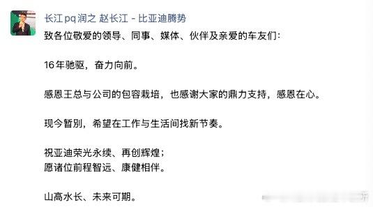 长江哥正式告别比亚迪,开启新征程。新能源汽车
