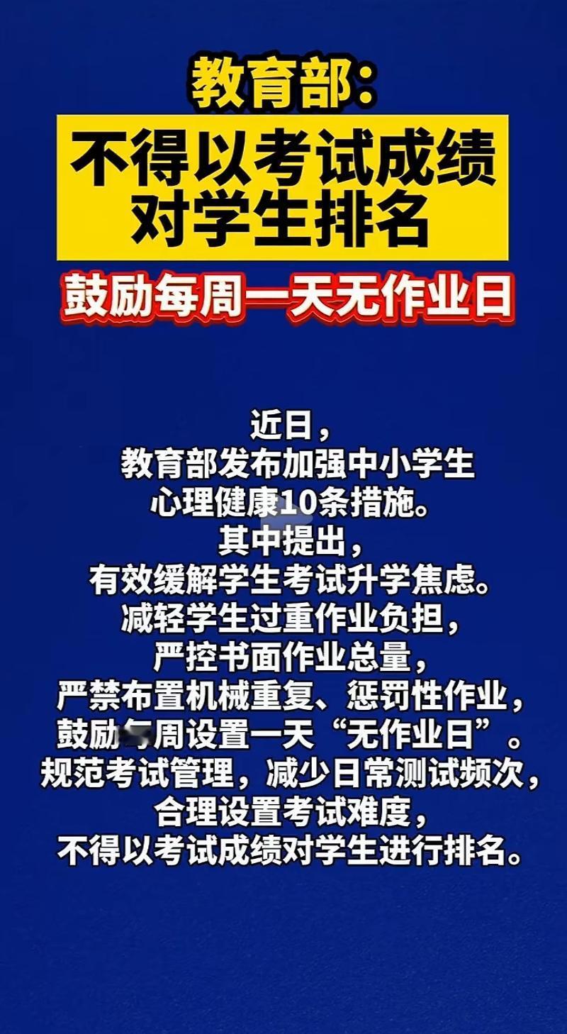 想都不用想,肯定有一部分人跑出来说:你可以不写的!你可以让孩子选择不做,不能因为你的孩子就给优秀的孩子降低标准。 学渣觉得布置的多了,学霸在完成老师布置的作业之外还要再找一些做,这就是差距。 任何减负政策在他们看来,都是在给优秀者设限。但教育的目的,究竟是筛选,还是培养? 很多人可能一辈子也没想明白:用同一把尺子量所有人,量出的不是差距,而是人生绝望。 孩子的优秀,绝对绝对不是只能通过做不完的作业来证明! 教育部:鼓励每周一天“无作业日”