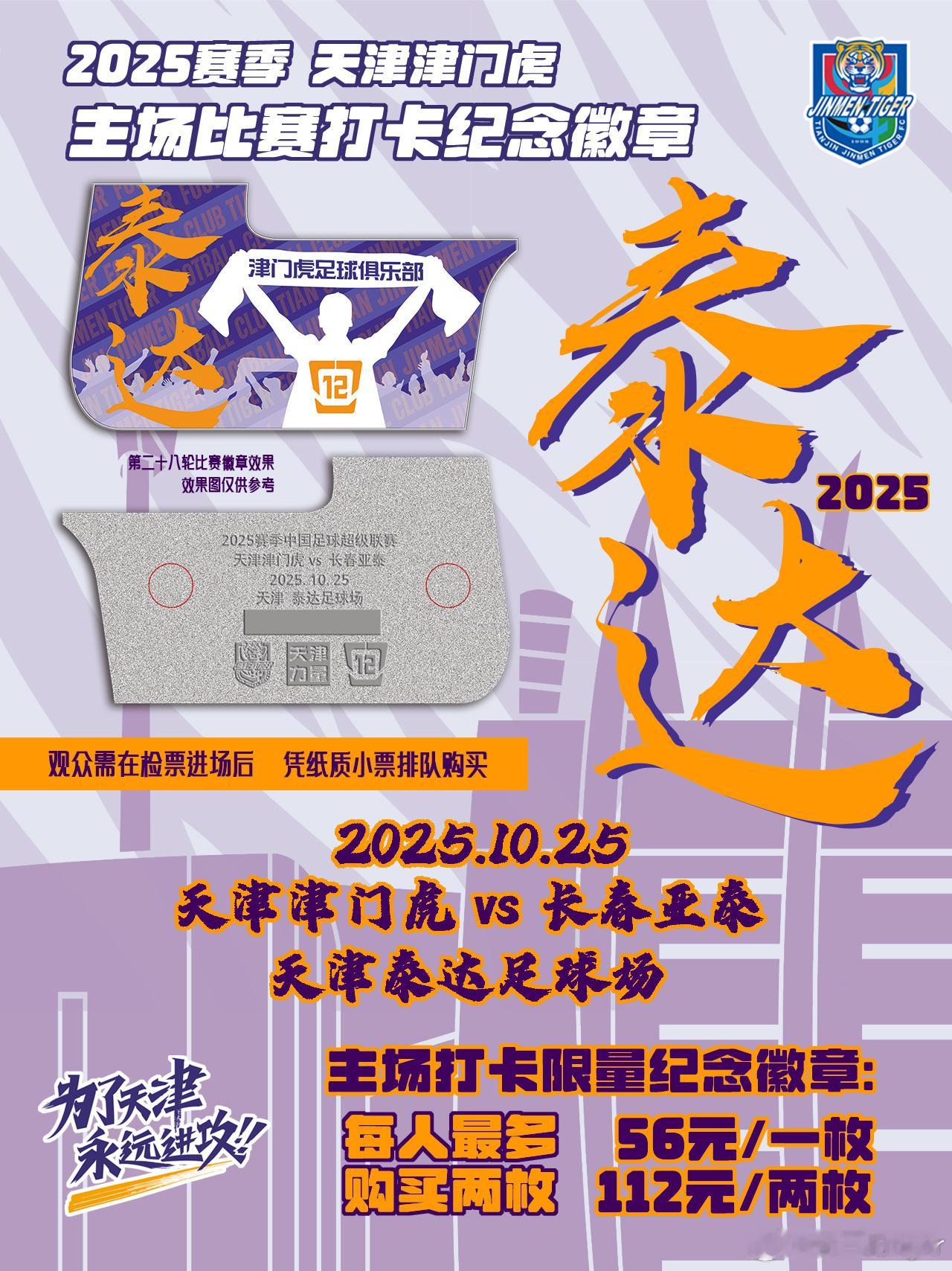 打卡徽章将于泰达足球场一号门,津门虎球迷体验店门外销售,请大家注意排队位置和秩序。