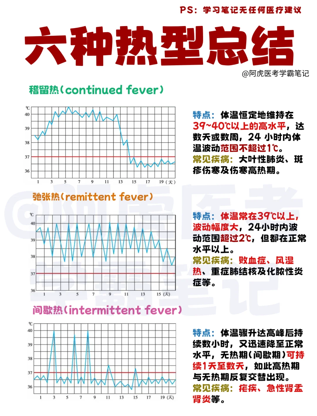 稽留热:刘大爷上班 弛张热:张飞拜师结盟 间歇热:急于歇息