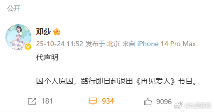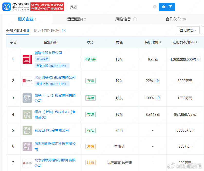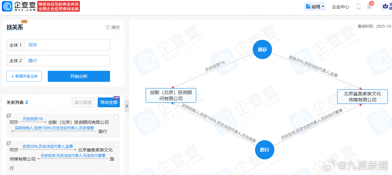 【#邓莎今年刚退股路行公司#】#回顾路行邓莎商业关联#10月24日,邓莎代发声明,称因个人原因,路行即日起退出《再见爱人》节目。从企查查APP获悉,当前路行共关联有北京创联教育投资有限公司、创联(北京)投资顾问有限公司等8家公司,邓莎关联有大连医谷科技有限公司、北京渔歌医谷科技有限公司、北京鲨鱼家族文化传媒有限公司等5家公司。今年4月,邓莎退股路行名下创联投资顾问公司,邓莎当前持股20%的北京鲨鱼家族传媒公司早期由路行担任执行董事、法定代表人职务。#路行退出再见爱人5#