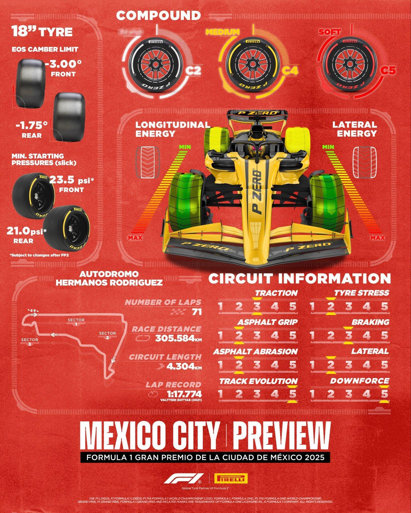 这一周墨西哥城大奖赛,倍耐力再一次带来了跳档配方的轮胎:C2、C4和C5。前轮胎压比去年增加了0.5psi