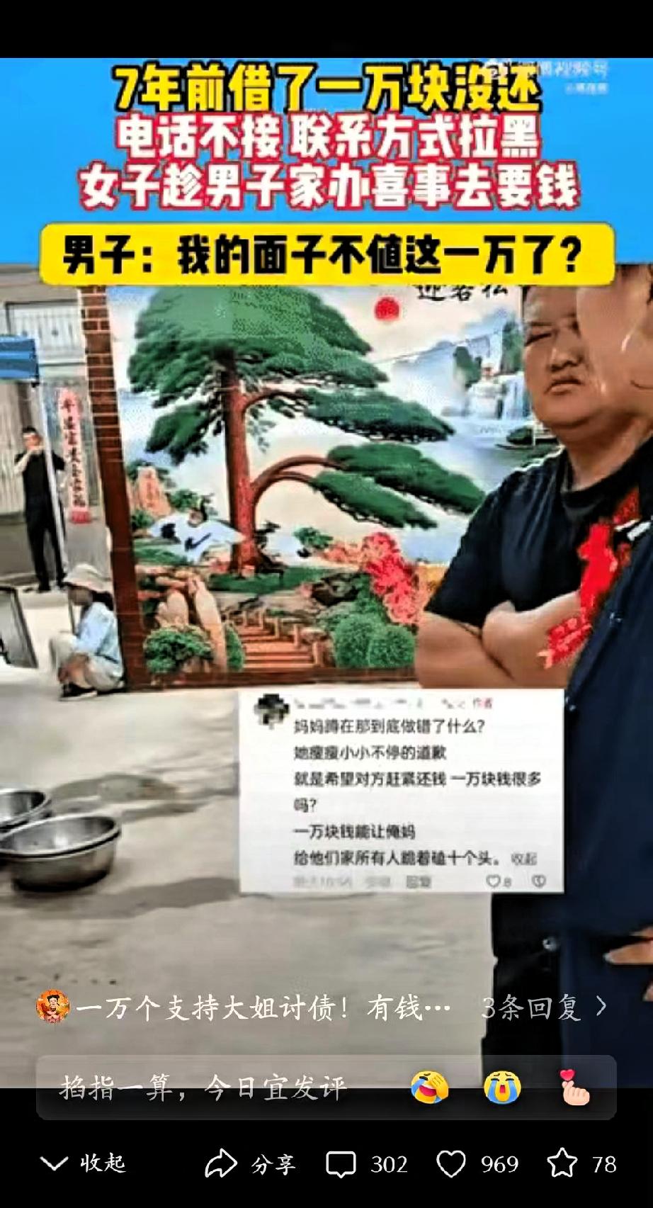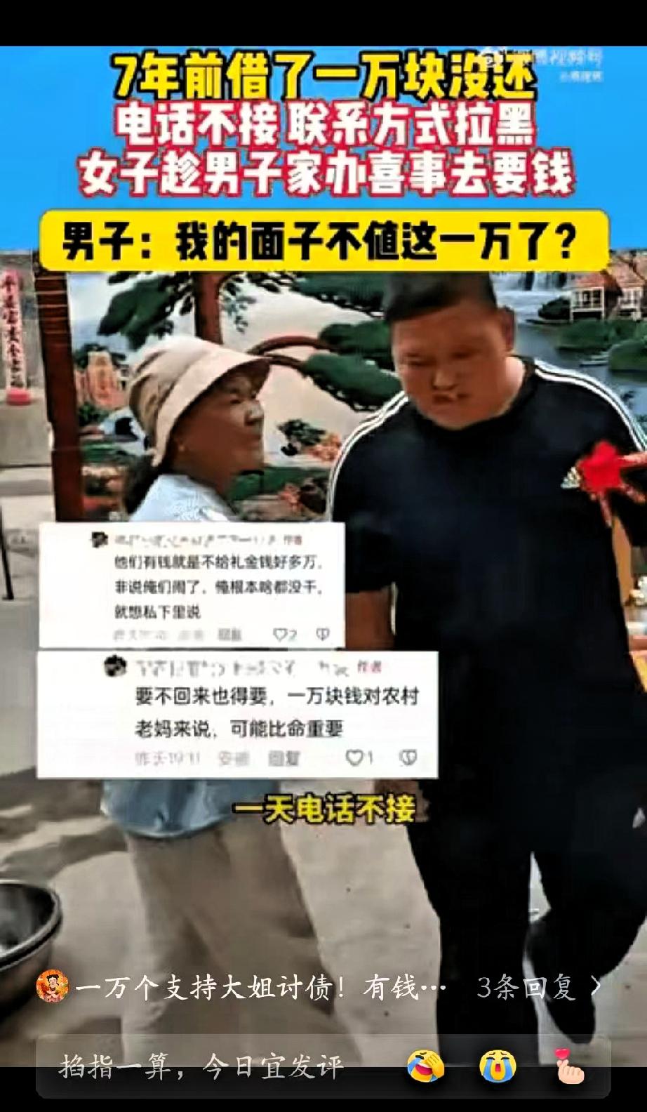 丢脸丢到家了!”安徽一男子给儿子办婚礼,本想风风光光办场喜酒,结果直接变成大型“丢人现场”,看完这事的人没一个同情他,全说:“纯属自找的!” 当家里喜气洋洋,宾客坐了满满十几桌,新人刚敬完长辈酒,突然一个大姐快步冲进来,直愣愣站在主位男子面前,声音不大却字字清晰:“七年了,你欠我的一万块,今天必须还!” 全场瞬间鸦雀无声,所有人的目光“唰”地全聚在男子身上。他脸一下就青了,说: “我的面子不值一万” 大姐早有准备,直接从包里掏出手机点开转账记录,又拿出一张折得整齐的借条拍在桌上:“你好好看看!七年前你生意赔光,蹲在我店门口哭着借钱,我心疼你不容易,当天就转了一万!这几年我找你要了不下十次,你次次说没钱,怎么给儿子办婚礼就有钱了?” 证据摆在眼前,男子瞬间哑了火,站在那手都不知道往哪放,脸憋得通红。旁边亲戚朋友交头接耳,有人小声议论“真没想到他是这种人”,还有人偷偷拍照,原本热闹的婚礼,一下变得尴尬又难堪,新郎新娘站在旁边,头都快低到胸口了。 说真的,谁这辈子没遇到过难处?人家大姐当初借钱是情分,是把他当能处的人。可他倒好,日子过顺了就翻脸不认账,把别人的好心当垃圾。一万块钱不多,却买走了自己的诚信,还让儿子的婚礼成了别人的笑柄,这笔账算得也太蠢了! 做人啊,诚信才是根本,欠的钱能还,丢的脸可捡不回来。要是你碰到这种欠钱不还、还躲着藏着的人,你会像大姐这样直接去他的重要场合讨账