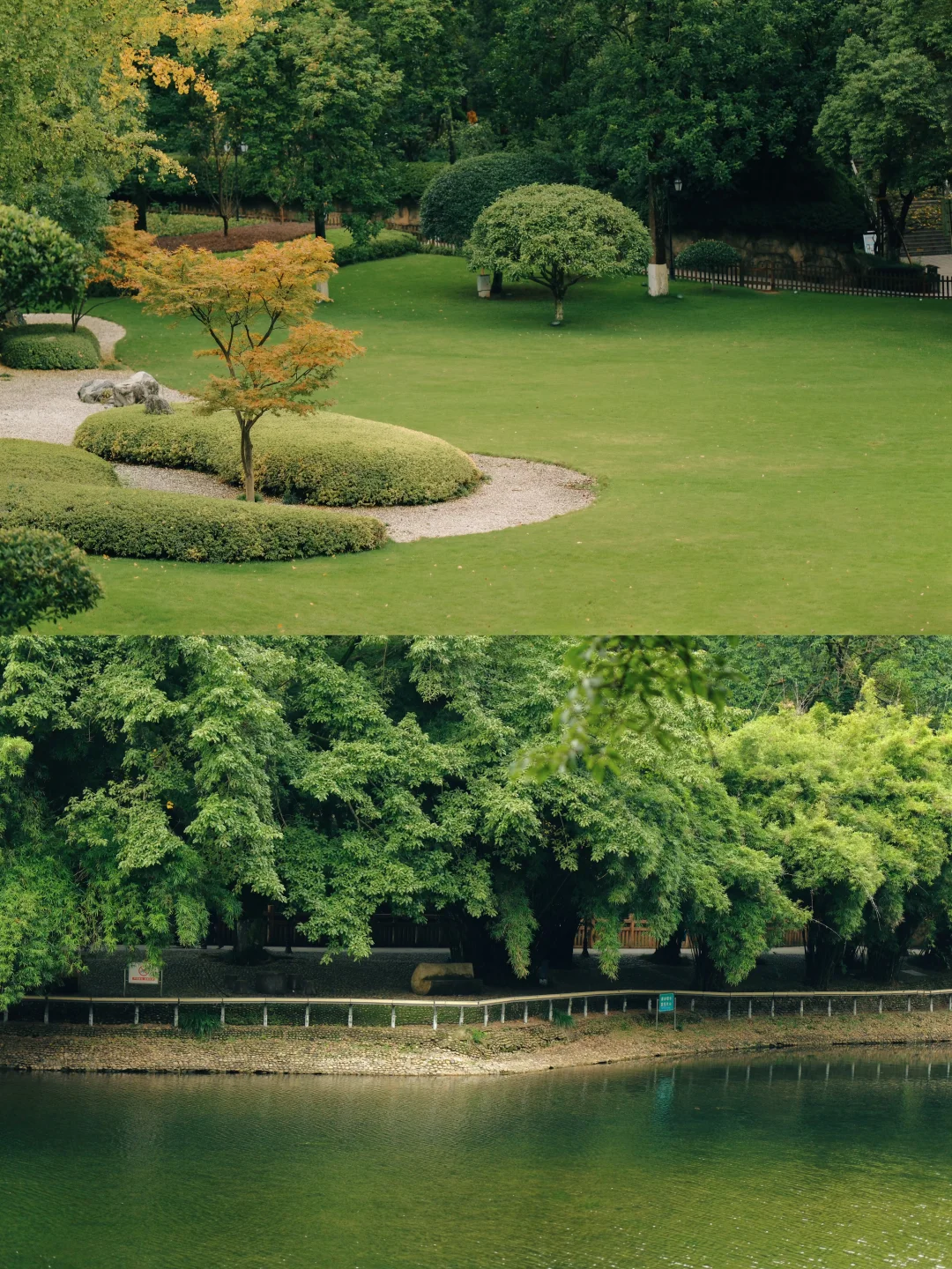 顺着荷塘走到对面草坪,周边种了不少枫树,再等半个月叶子会更红。草坪搭配周围的森林,随便拍都是清新感照片,坐这儿晒太阳也超舒服。