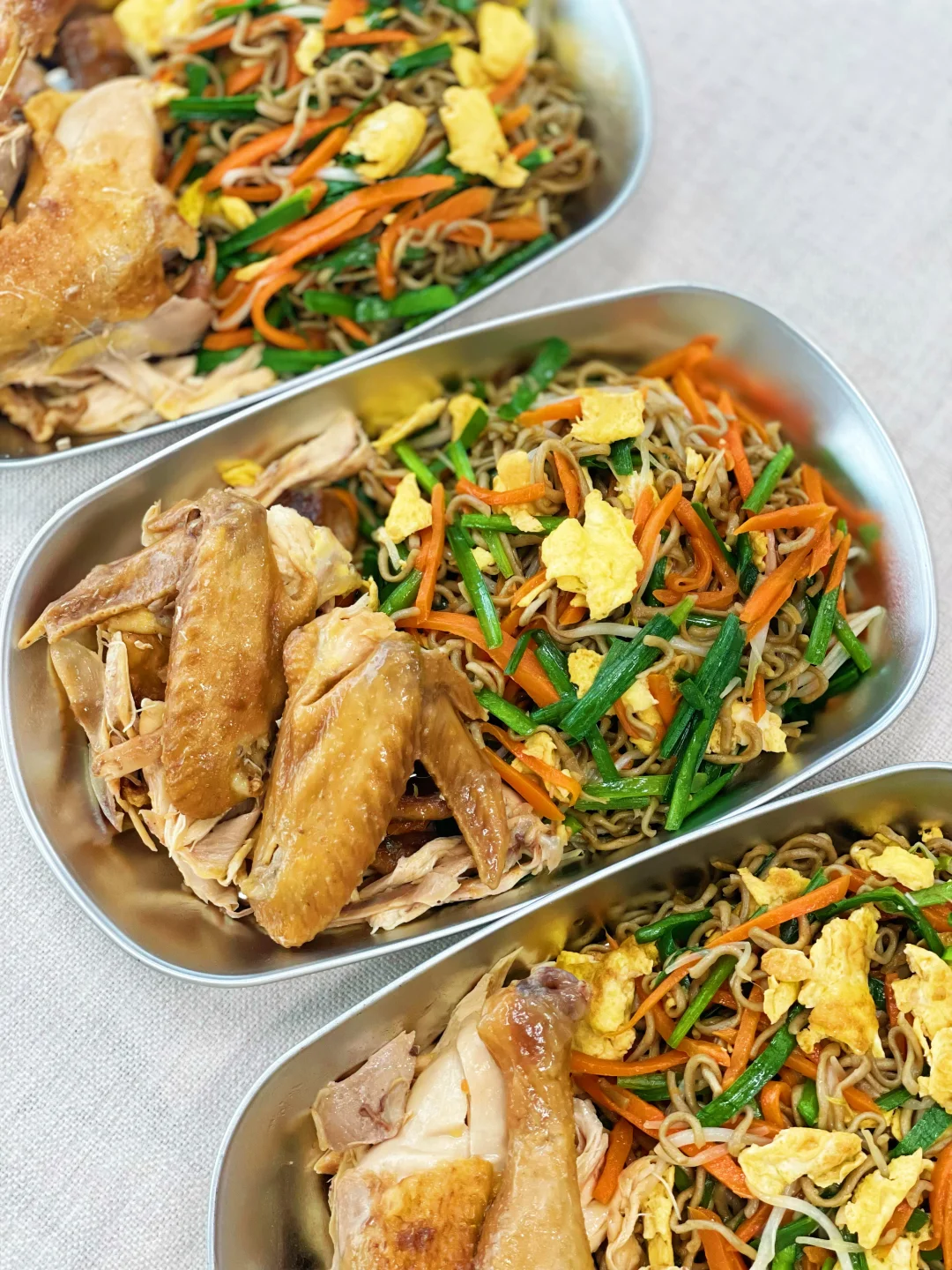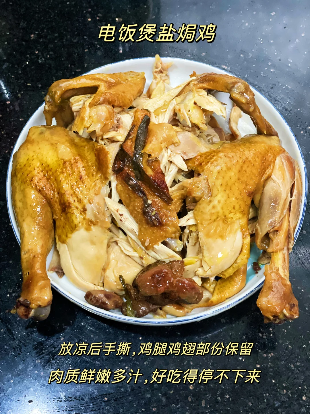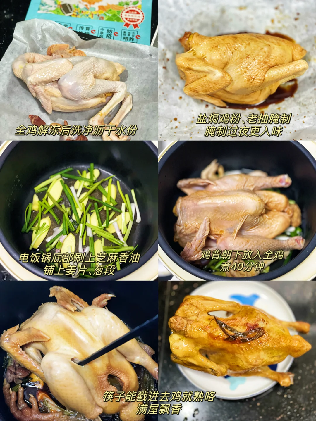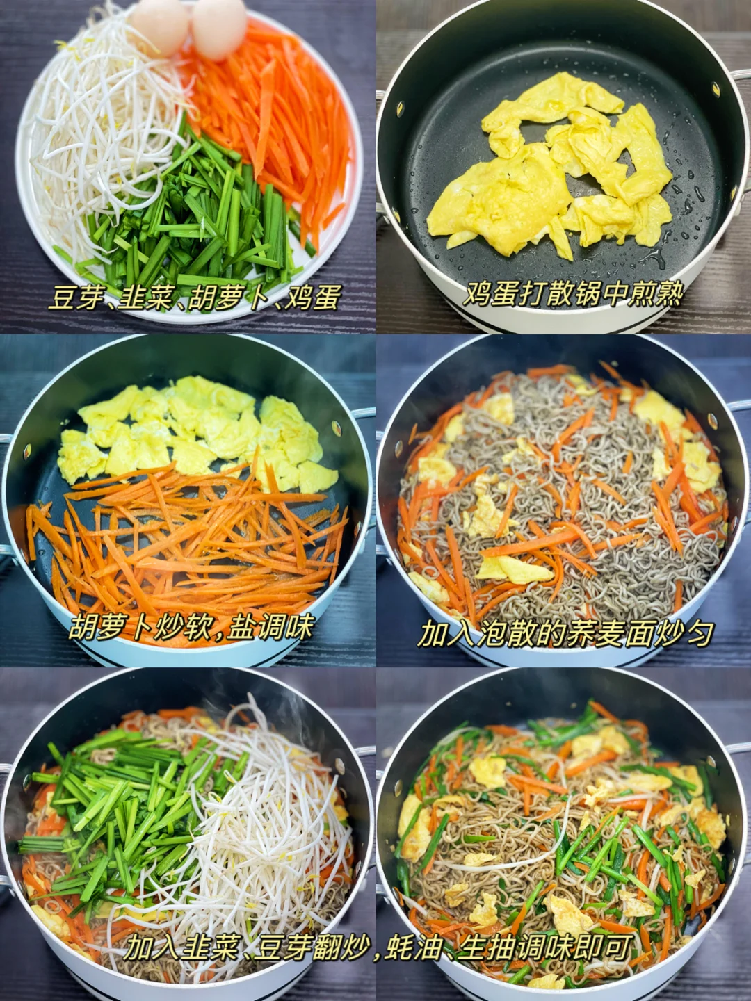 的三餐四季 🌟盐焗手撕鸡 全鸡|盐焗鸡粉|老抽|葱姜|芝麻油 1️⃣全鸡用盐焗鸡粉、适量老抽(用于上色)腌制2小时以上,腌制一夜更佳 2️⃣电饭煲底部抹上一层芝麻油,铺上葱姜。鸡背部朝下,煮40分钟。筷子能轻松戳进去就可以啦! 3️⃣煮好的盐焗鸡放温就可直接撕开 🌟鸡蛋鲜丝炒荞麦面 鸡蛋|韭菜|豆芽|胡萝卜|荞麦面|生抽|蚝油 1️⃣鸡蛋煎熟用锅铲切成小块,胡萝卜丝炒香,盐调味 2️⃣加入提前泡开的荞麦面炒匀,加入韭菜、豆芽 3️⃣蚝油、生抽按照自己的口味一起炒匀即可