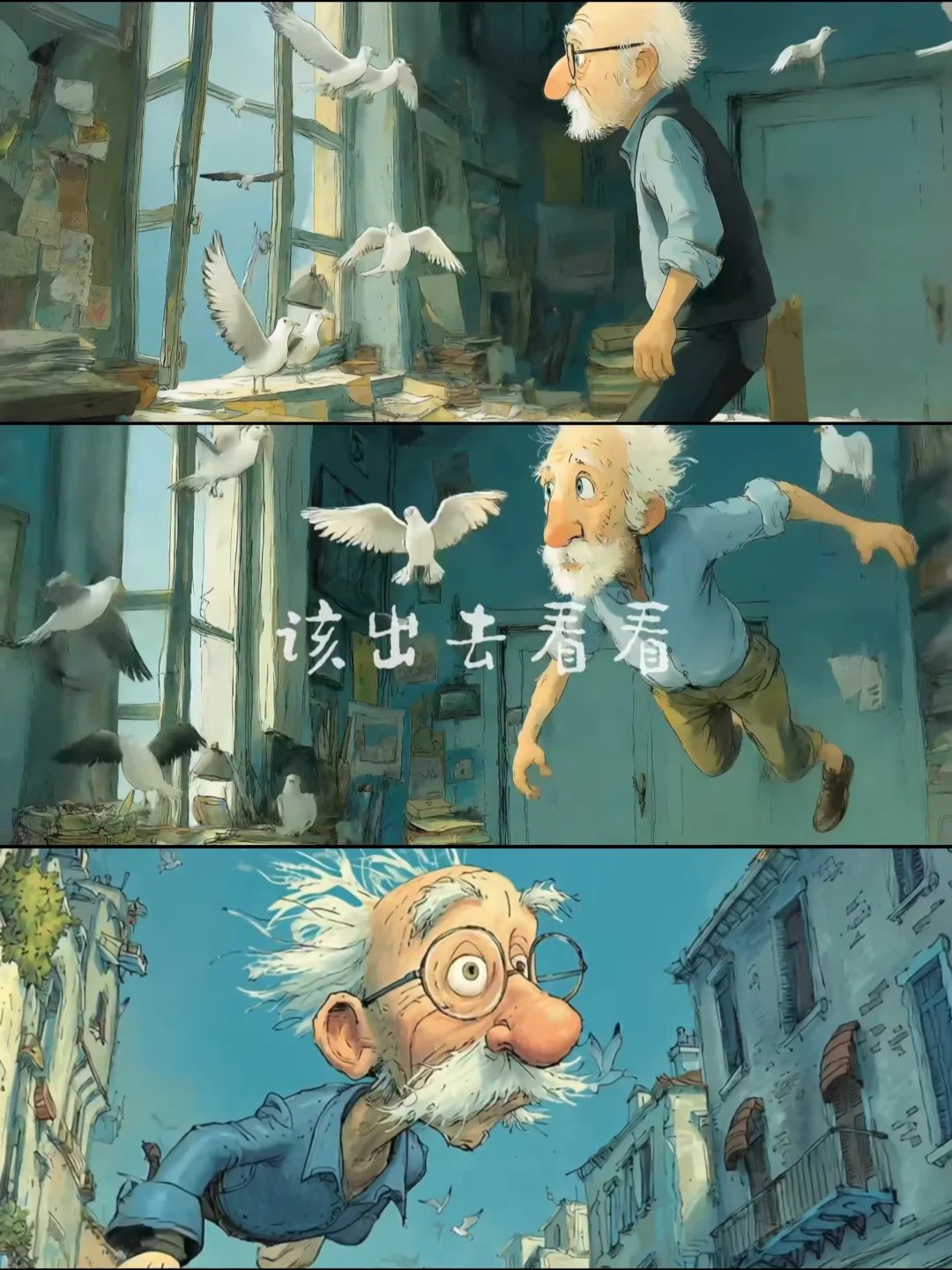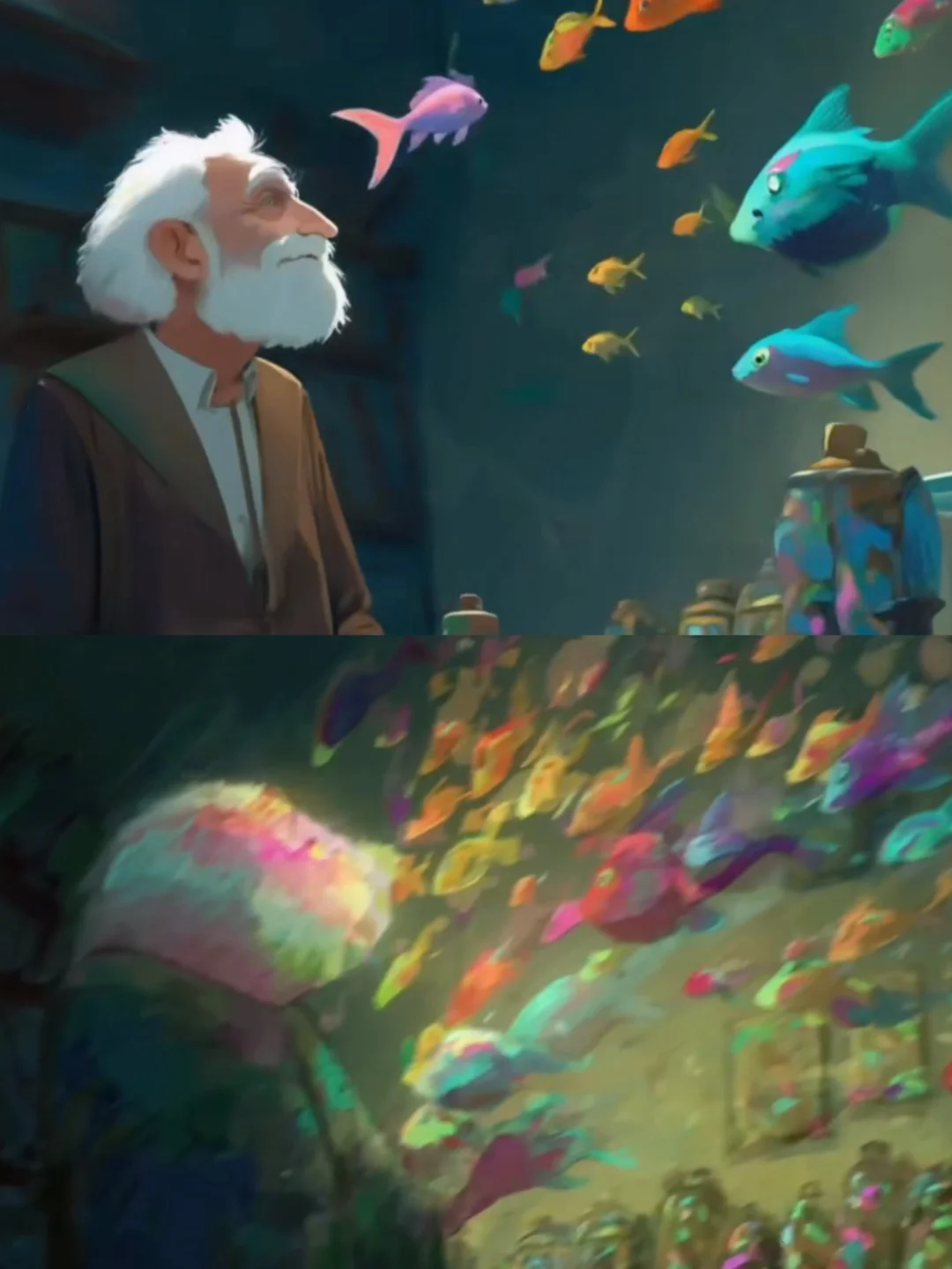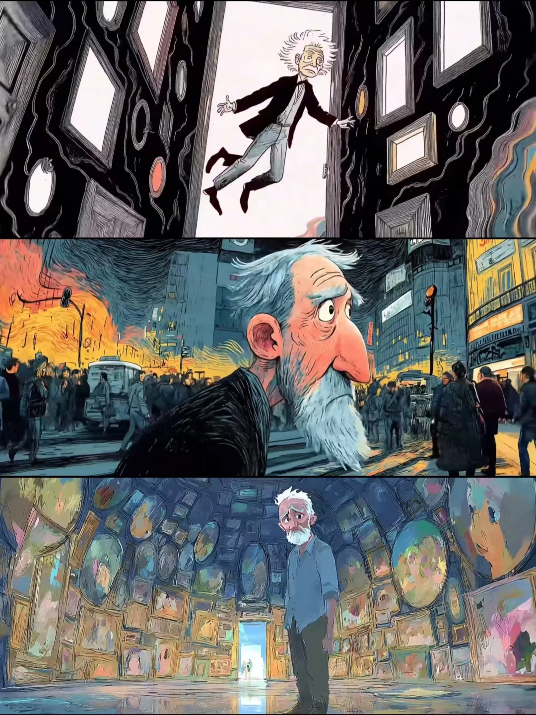 故事开篇用一抹永不褪色的暖黄光影,将我们轻轻推入了阿尔茨海默症老人的内心宇宙,从停留在鱼缸边的身影,到找寻色彩的老顽童,到老式相框在虚空中沉浮,到熟悉的家具如海市蜃楼般重组,到幻化成飞鸟的老小孩儿从空中掠过,更令人震撼不已的是街道上、博物馆里,不断闪现的一个个老者的背影,他们看似形单影只却又有着五彩斑斓丰富的阅历,这一针针画面不正是在默默诉说着老人内心的奇幻风景吗?千帆过尽,既温情又震撼!这些由AI精心编织的视觉诗篇,让抽象的病症化作可感知的温度,它不是在讲述遗忘,而是在每个细节里印证着“即使忘记全世界,爱的感觉依然在”的真相......