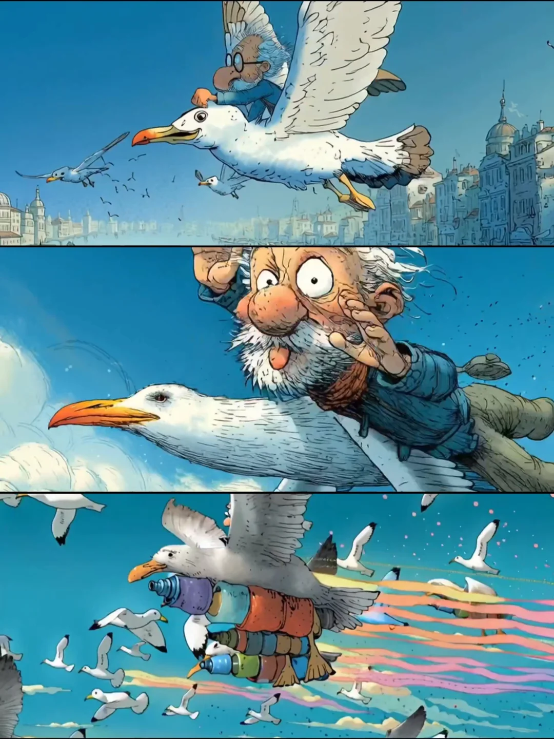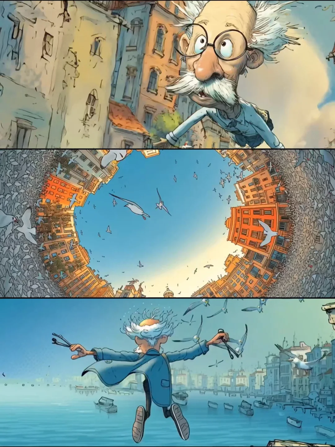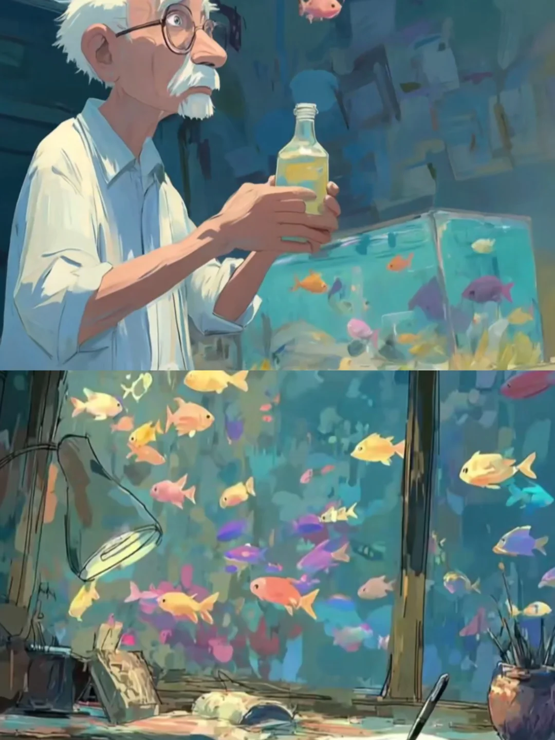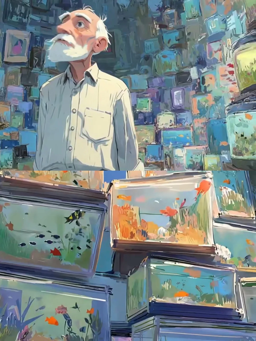 故事开篇用一抹永不褪色的暖黄光影,将我们轻轻推入了阿尔茨海默症老人的内心宇宙,从停留在鱼缸边的身影,到找寻色彩的老顽童,到老式相框在虚空中沉浮,到熟悉的家具如海市蜃楼般重组,到幻化成飞鸟的老小孩儿从空中掠过,更令人震撼不已的是街道上、博物馆里,不断闪现的一个个老者的背影,他们看似形单影只却又有着五彩斑斓丰富的阅历,这一针针画面不正是在默默诉说着老人内心的奇幻风景吗?千帆过尽,既温情又震撼!这些由AI精心编织的视觉诗篇,让抽象的病症化作可感知的温度,它不是在讲述遗忘,而是在每个细节里印证着“即使忘记全世界,爱的感觉依然在”的真相......