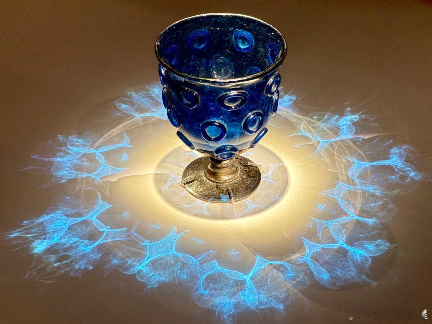 从此展品中的第一明星是在波斯制作玻璃,在唐朝制作杯脚的蓝色琉璃杯,这件晶莹剔透的宝物口径8.6厘米,高11.2厘米,由于原料中的钴元素而显现出清冷的深蓝光辉,让人一看就为之倾倒。