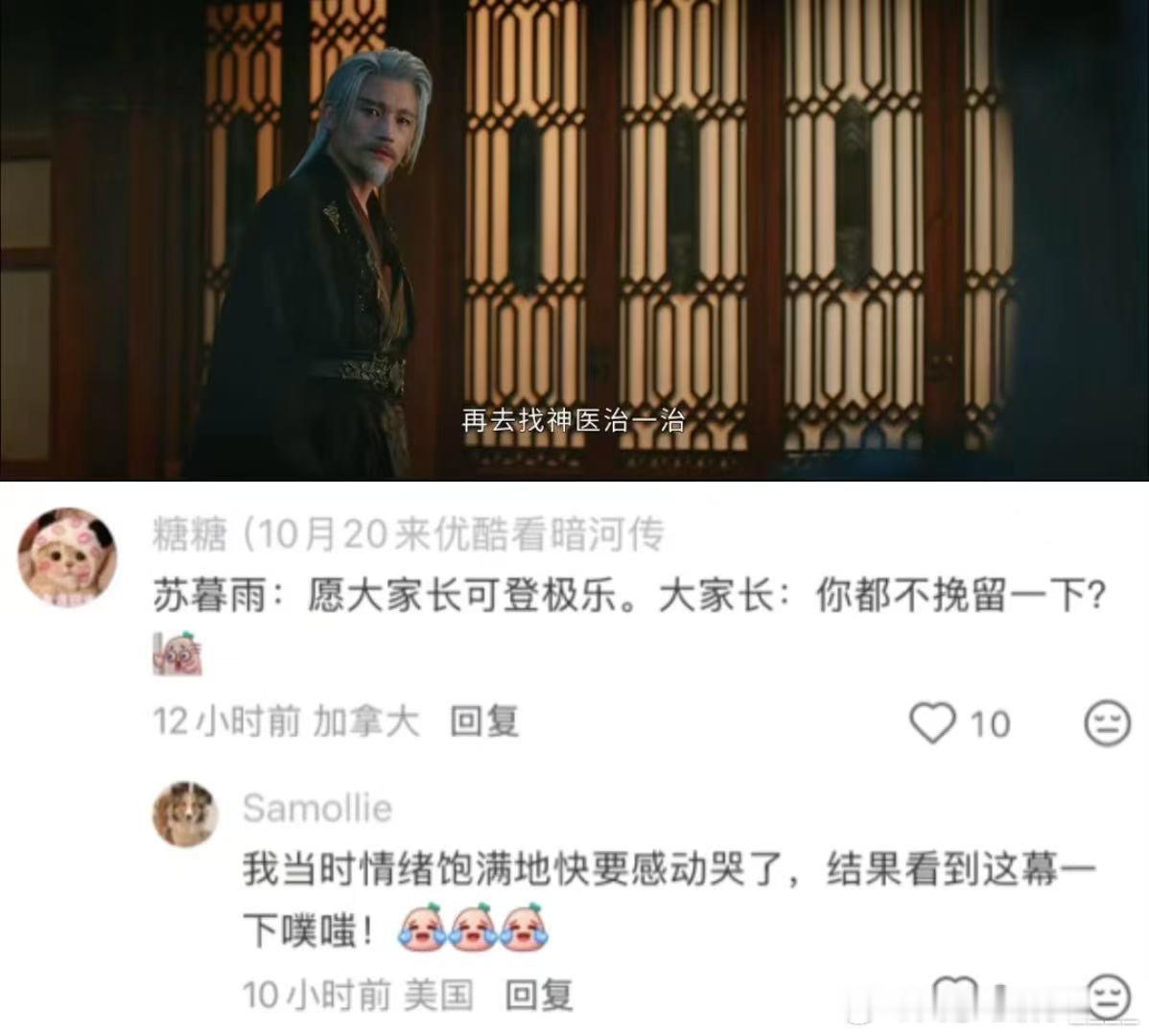 暗河传全是直肠子装不了一点 这剧中每次看到苏暮雨那句“我真服了”,我都笑得不行。苏昌河真是太傻,明明是想帮忙反倒闹了个大笑话,真的是直肠子本肚!