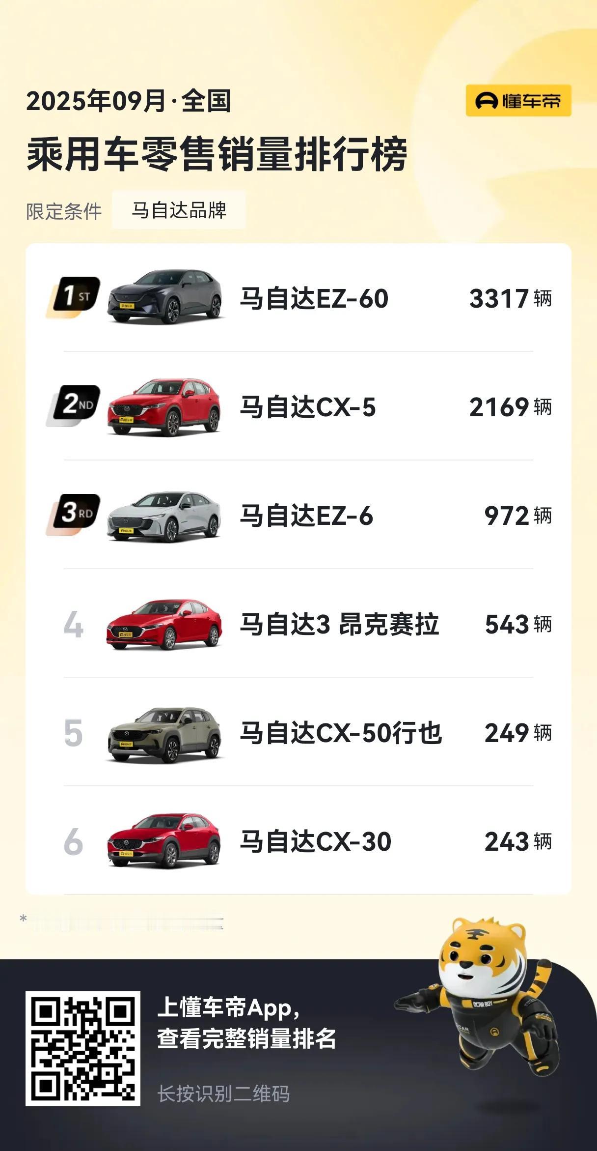你可能想象不到,现在马自达卖的最好的车型居然是新能源车。 在9月份的销量数据当中,马自达销量最好的车型是EZ-60,这是一款纯电的中型SUV,9月份的销量是3317辆,比第二名的马自达CX-5还要多1000多辆。 要知道,CX-5可是马自达的当家花旦车型,一直以来备受马自达粉的喜爱,尤其是现在降价到12万起售,在合资紧凑型SUV里面非常耀眼。 但是居然销量还不如本家的EZ-60。
