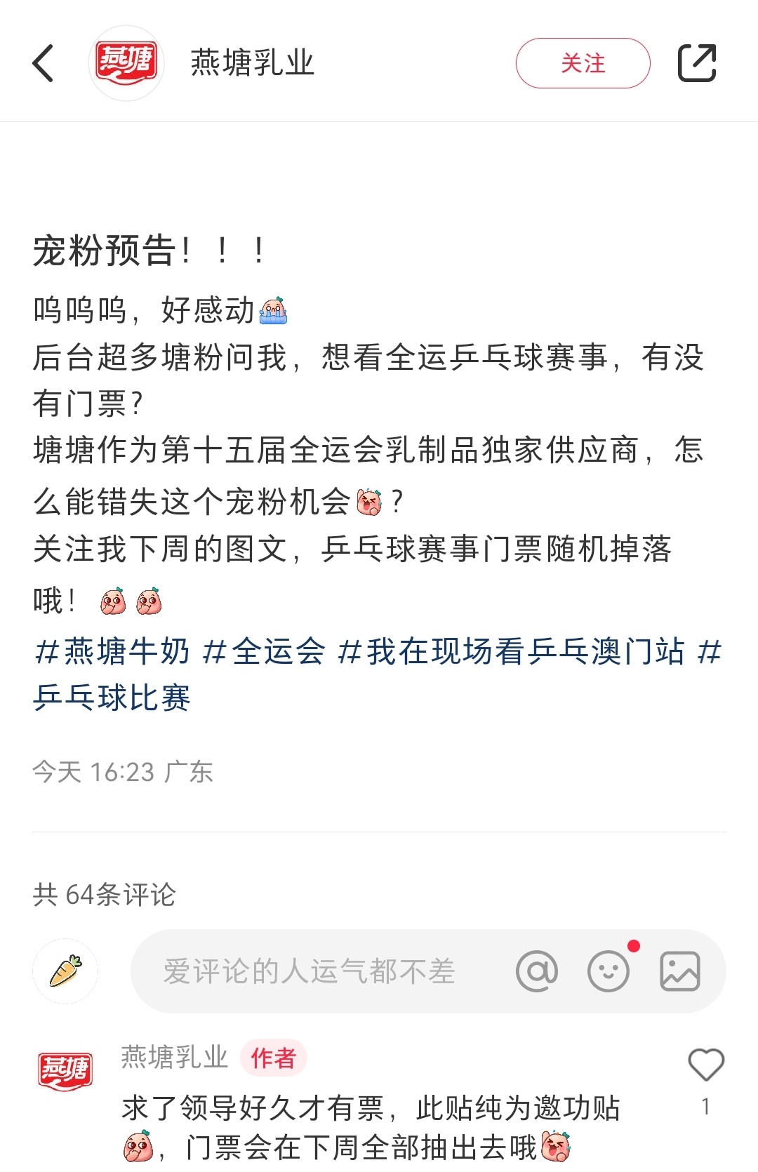 没票的可以关注下看他有啥活动