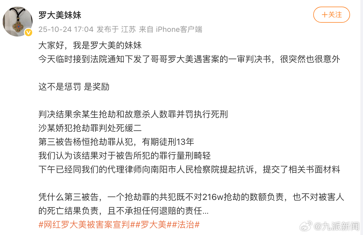 【 据天平南阳通报:2025年10月24日,河南省南阳市中级人民法院一审宣判被告人余金生抢劫、故意杀人及被告人沙玉姣、杨恒抢劫一案,以故意杀人罪、抢劫罪判处被告人余金生死刑;以抢劫罪判处被告人沙玉姣死刑,缓期二年执行;以抢劫罪判处被告人杨恒有期徒刑十三年;对三被告人依法适用剥夺政治权利、没收财产、罚金等附加刑,并责令退赔被害人亲属经济损失。10月24日下午,发文:我们认为该结果对于第三被告所犯的罪行量刑畸轻,下午已经同我们的代理律师向南阳市人民检察院提起抗诉,提交了相关书面材料。
