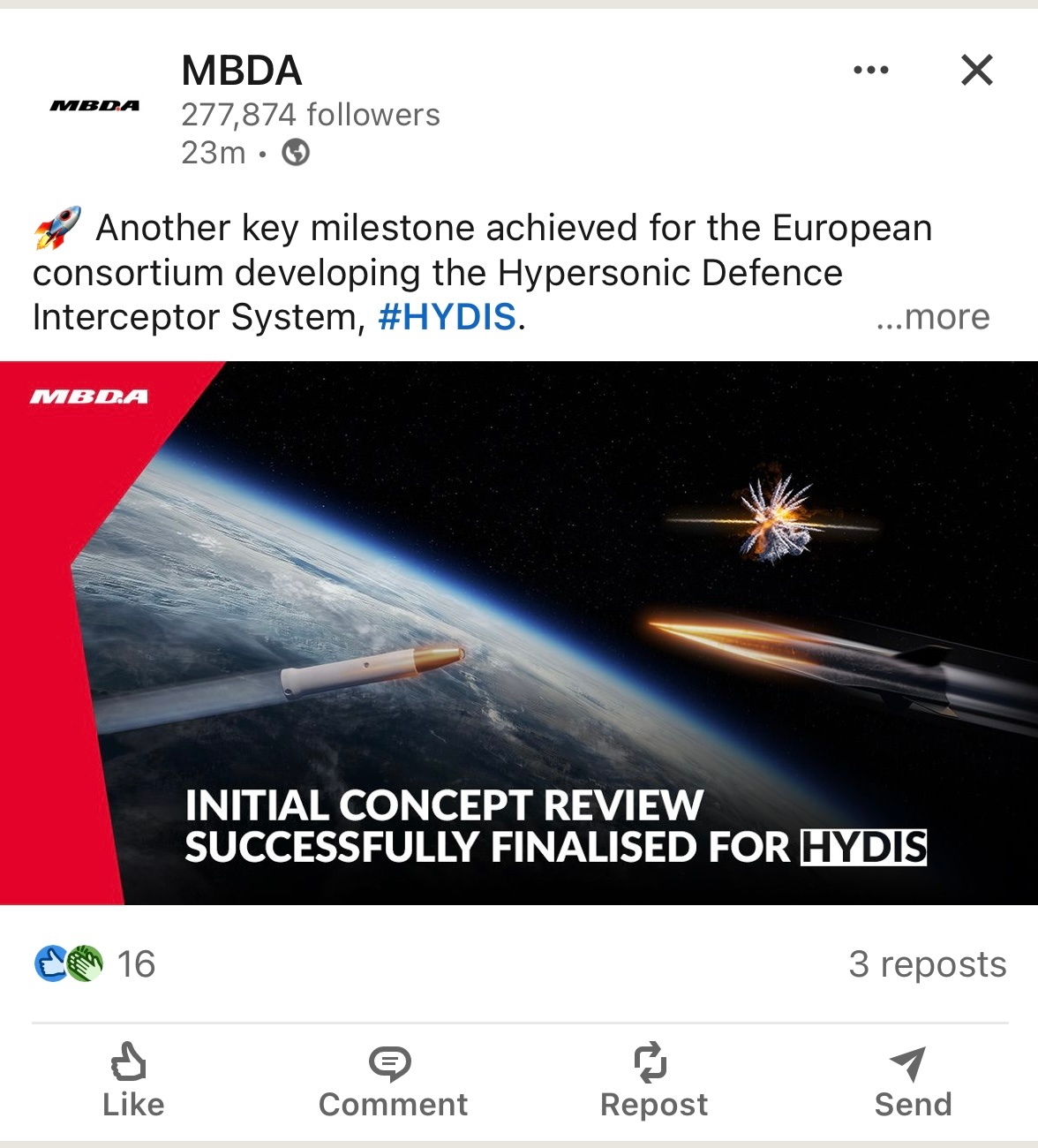 评论:终于选边了,不过作为MBDA集团初创国之一,又参与了PAAMS和Aster 30,不选同一个阵营的HYDIS会很逆天[二哈];另一个阵营则是由🇩🇪Diehl公司牵头的HYDEF。