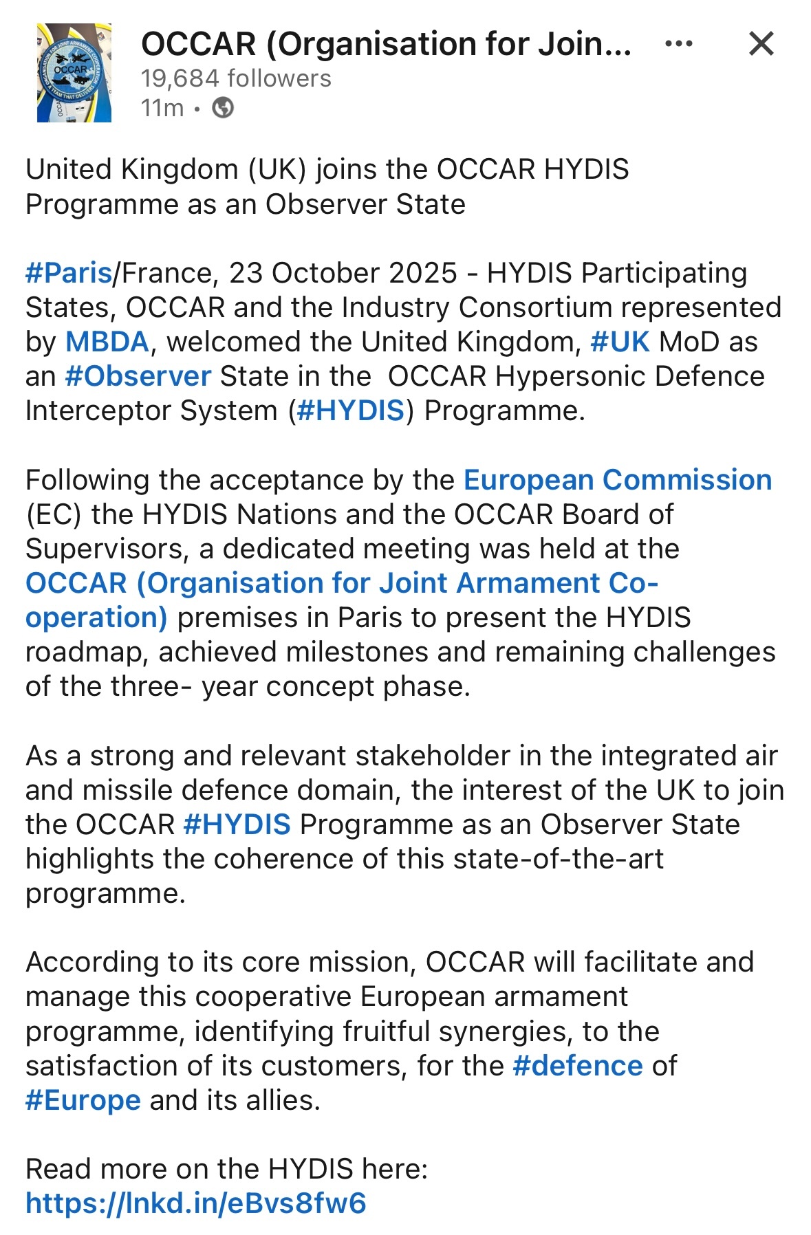 烽火问鼎计划 由MBDA集团牵头的🇫🇷🇮🇹🇩🇪🇳🇱HYDIS反高超项目正式通过✅了初版概念设计审核里程碑(图1: OCCAR;图2: MBDA)