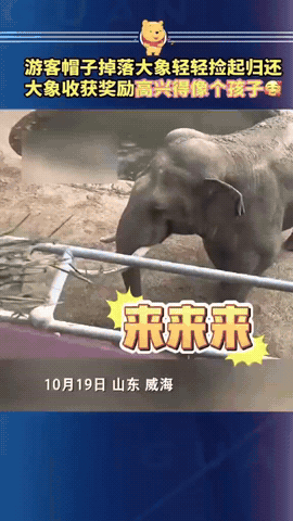 太可爱了! 这头大象火了!不但威海人知道了,而且火上人民日报了! 网上刷到山东威海一游客帽子掉了,聪明的大象用鼻子捡起来,还帮抖抖土归还,被投喂后它开心的舞了起来,太可爱了!大象很聪明,用善行为自己挣到了生活费和美味!这是人与动物良好互动的典范!